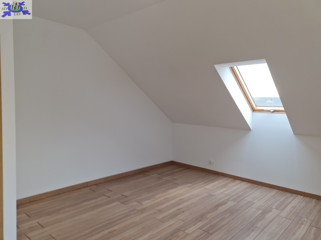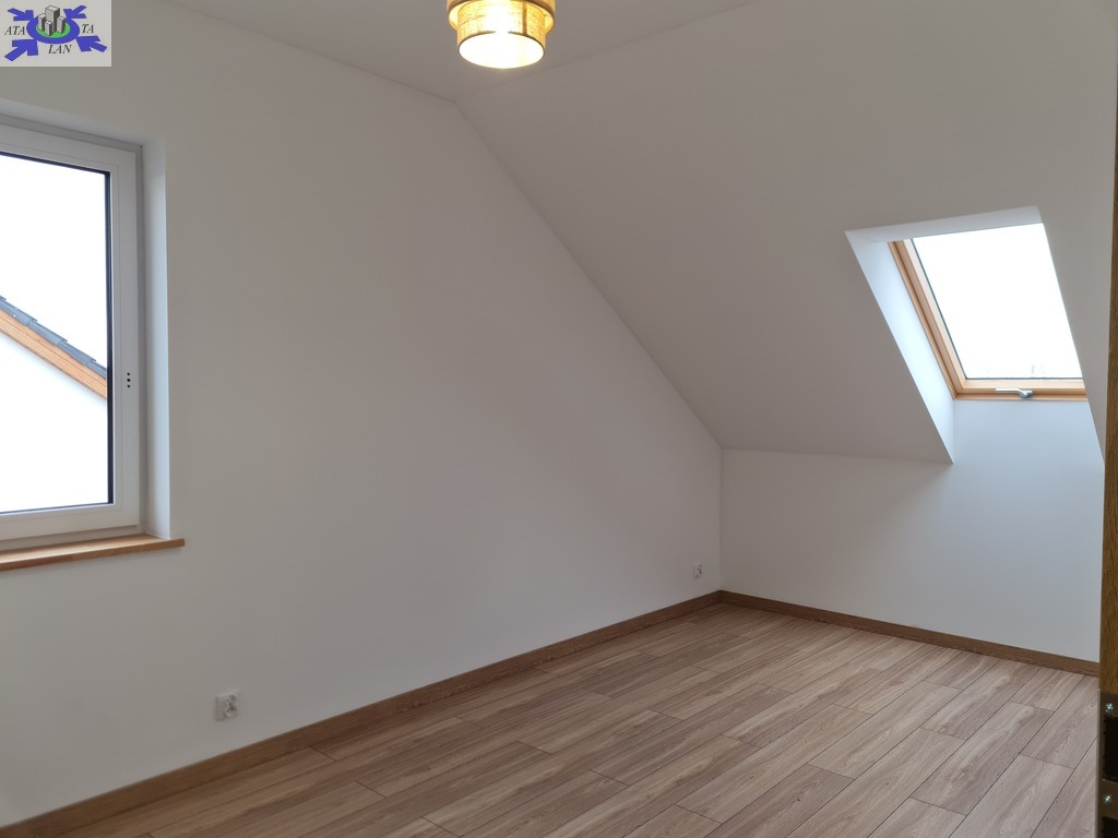 Dom składa się z salonu otwartego na kuchnię, sypialni, łazienki i hollu oraz na piętrze znajdują się z dwa rozkładowe sypialnie i łazienka.