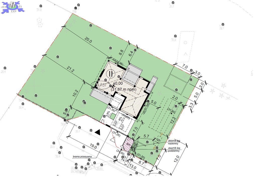 Jej pow. to 1777 m2, ma kształt prostokąta. Wymiary 53,5 m x 35,0 m. Wjazd na działkę od strony południowo-zachodniej.