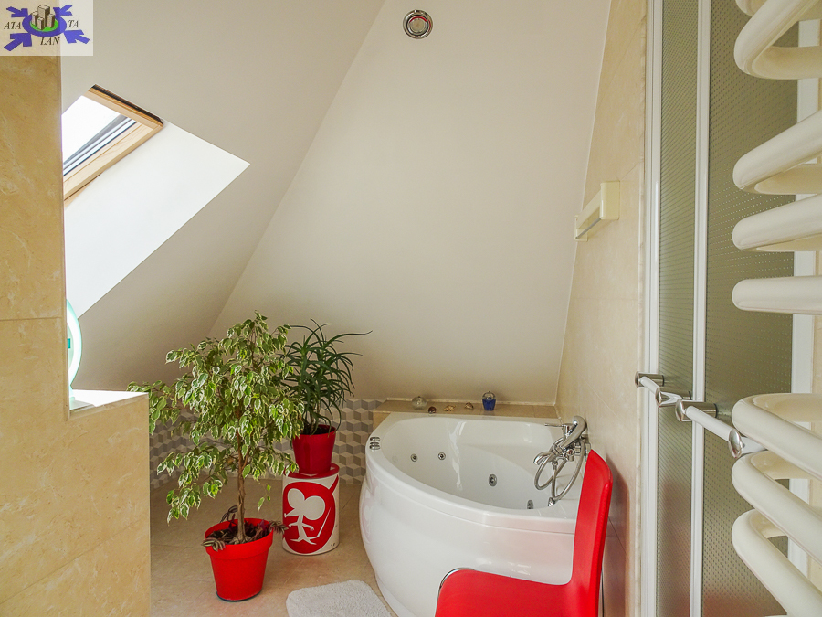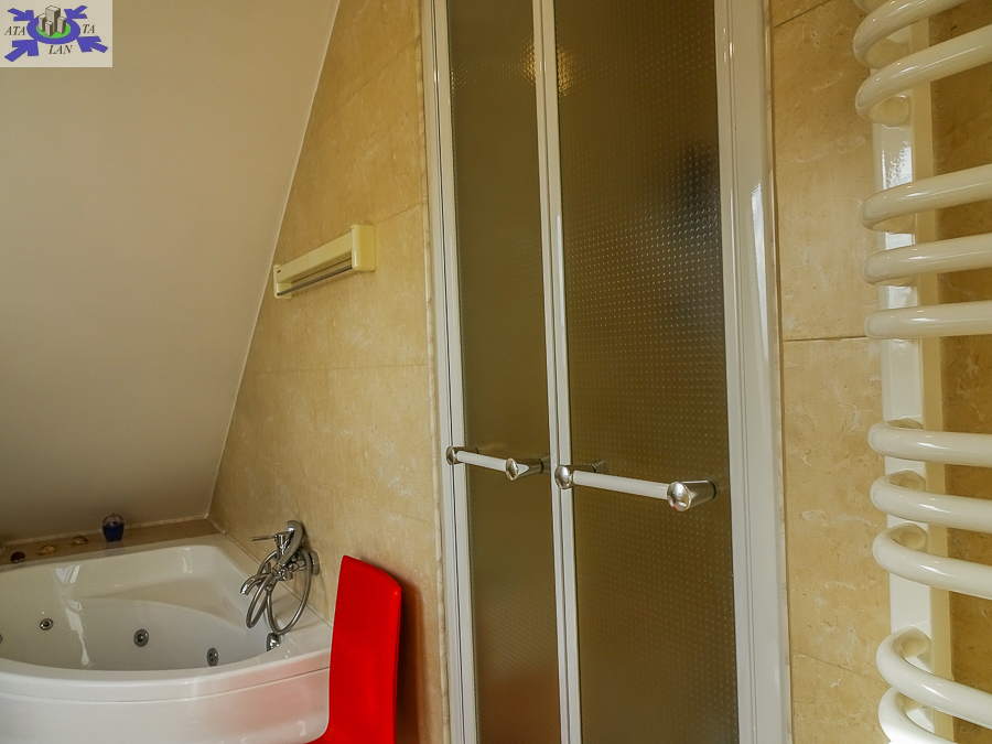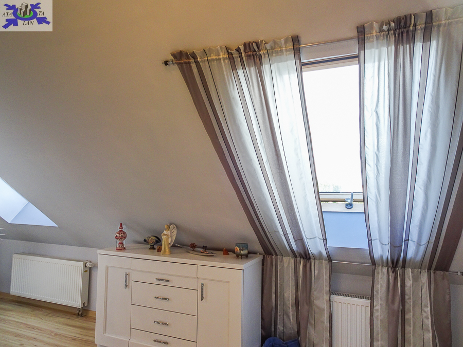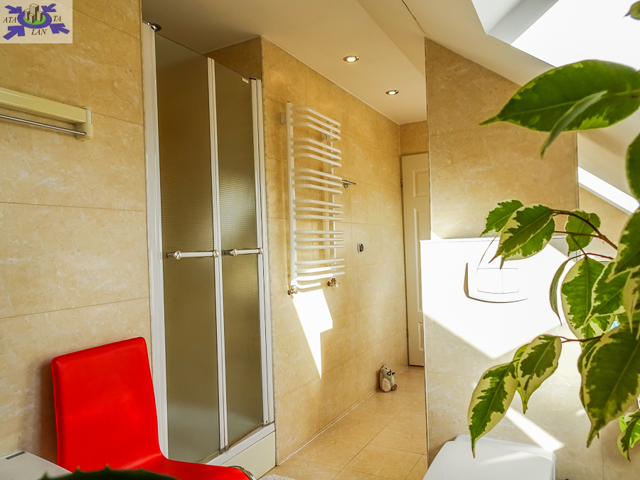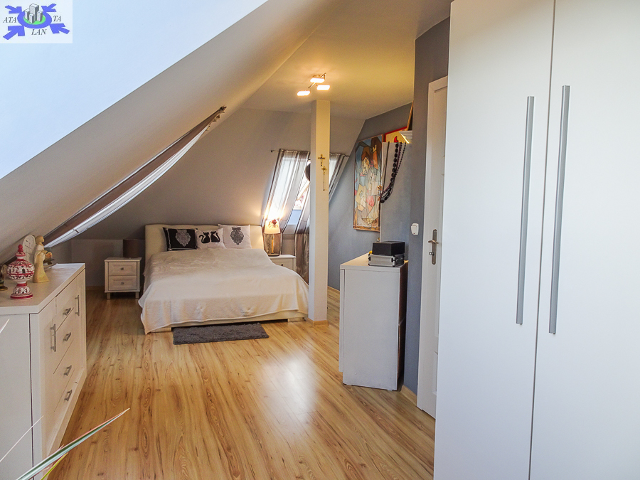 PIĘTRO ze skosami pokój o powierzchni użytkowej 11,63 m2 po podłodze około 20 m2 i sypialnia po podłodze ok. 20 m2 z wejściem do garderoby, i pomieszczenie gospodarcze. Łazienka 4 m2 po podłodze ok. 10 m2 w niej wanna narożna, kabina prysznicowa, umywalka WC razem. W łazience okno, jasna glazura i terakota, średnie rachunki za energię elektryczną 600 zł.