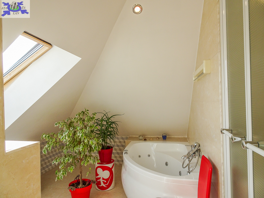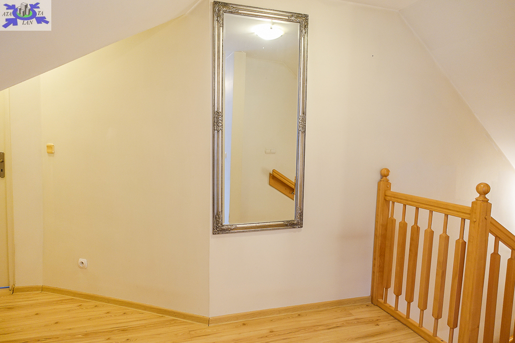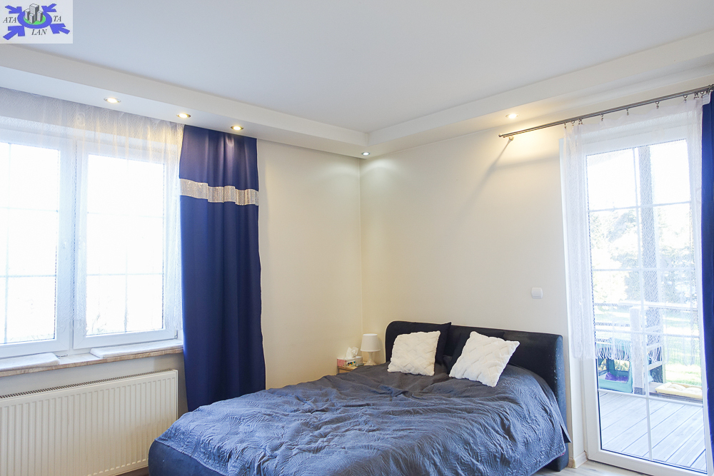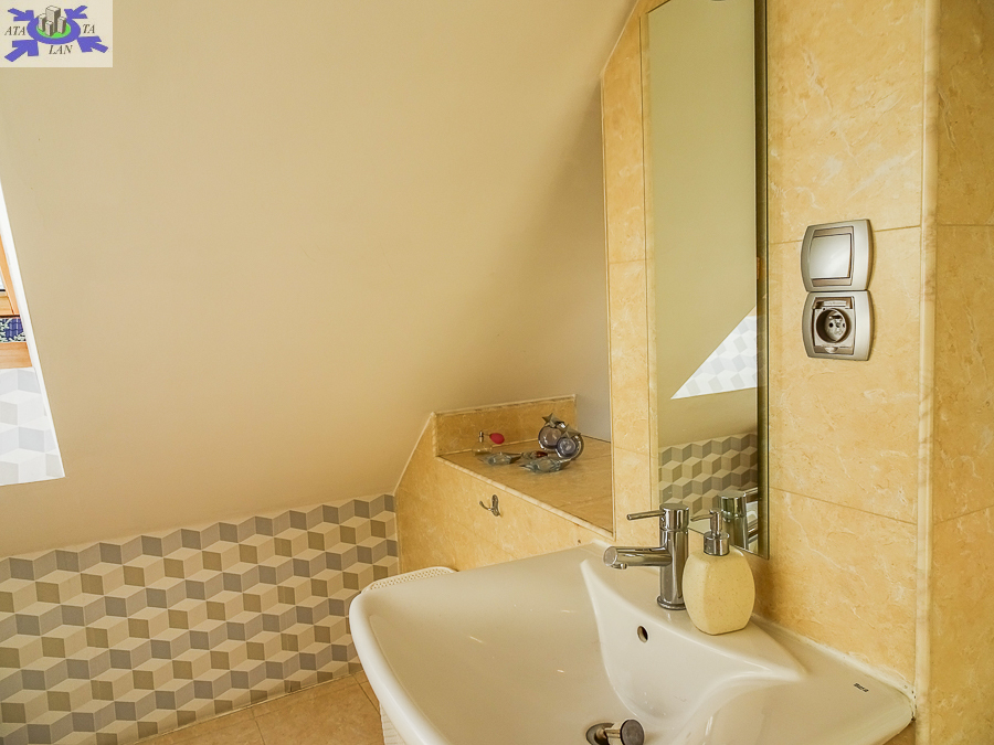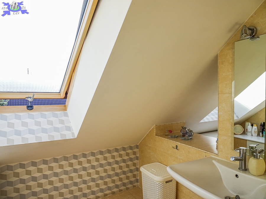 PIĘTRO ze skosami pokój o powierzchni użytkowej 11,63 m2 po podłodze około 20 m2 i sypialnia po podłodze ok. 20 m2 z wejściem do garderoby, i pomieszczenie gospodarcze. Łazienka 4 m2 po podłodze ok. 10 m2 w niej wanna narożna, kabina prysznicowa, umywalka WC razem. W łazience okno, jasna glazura i terakota, średnie rachunki za energię elektryczną 600 zł.