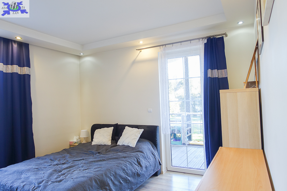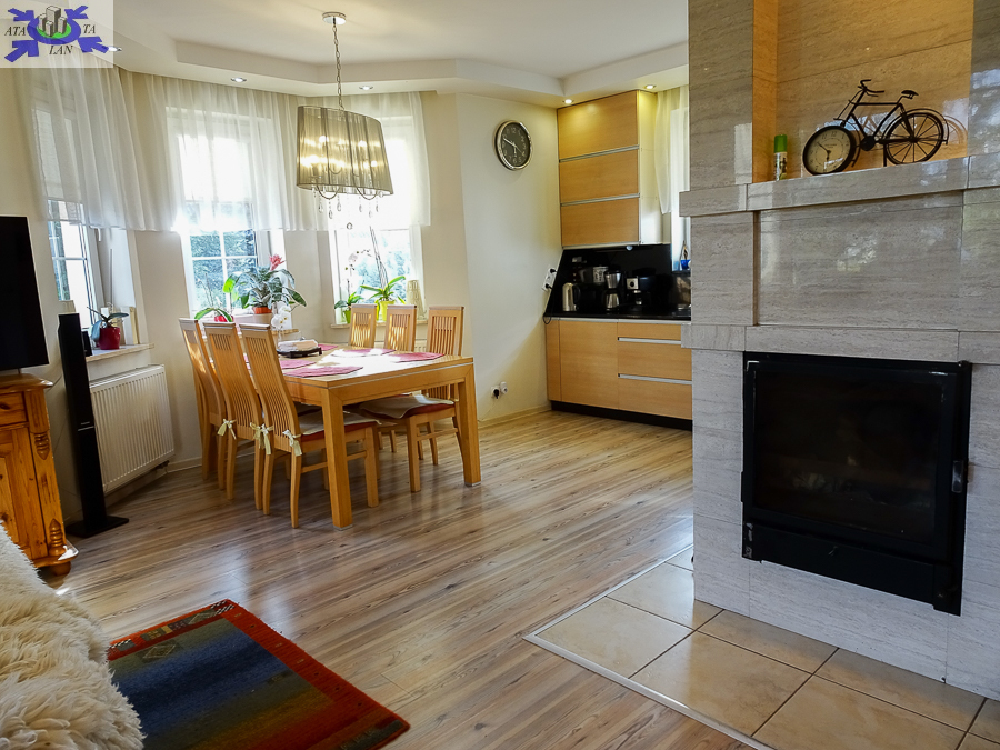 PARTER salon 24 m2 z wyjściem na taras drewniany o pow. ok. 15 m2 i dalej do pięknie utrzymanego ogrodu z drzewami i krzewami oddzielającymi ogród od ulicy i sąsiednich budynków. Salon otwarty na aneks kuchenny o powierzchni 6 m2 z nowoczesną zabudową i urządzeniami AGD dodatkowo kominek z płaszczem wodnym. 2 pokoje 14,4 m2 i 15,3 m2. Hall 5,39 m2, łazienka 5,12 m2, klatka schodowa 5 m2, sień 3,69 m2. W łazience wanna i toaleta z umywalką. Ogrzewanie elektryczne i kominkowe.