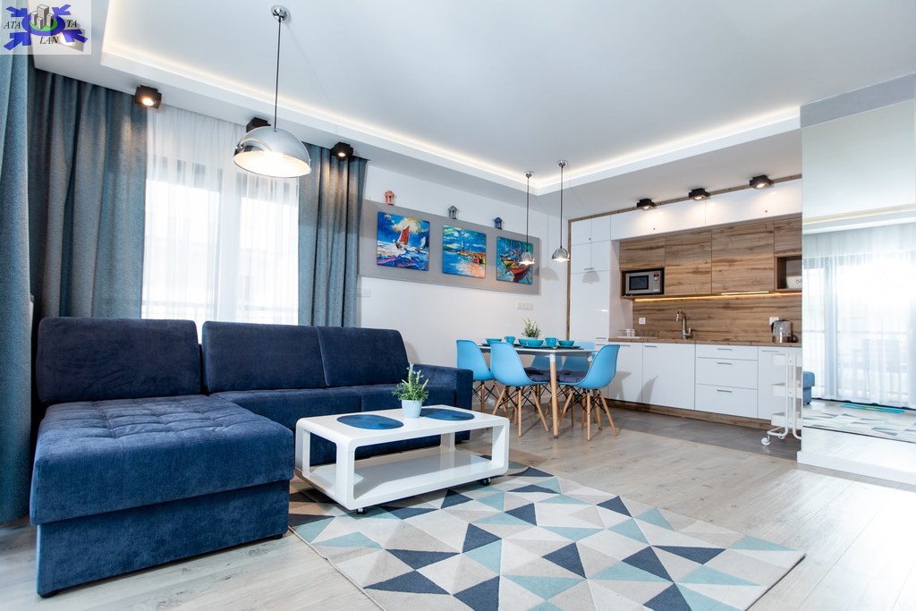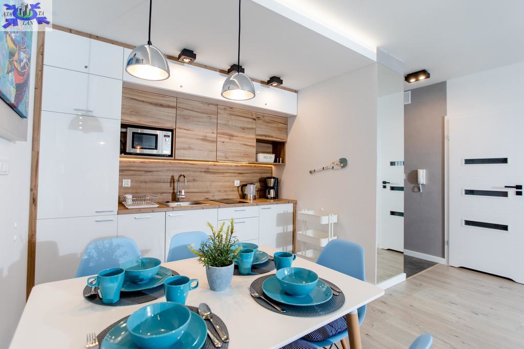 Apartament jest nowocześnie wykończony, z przestronną łazienką oraz kompletnie wyposażonym i umeblowanym aneksem kuchennym .