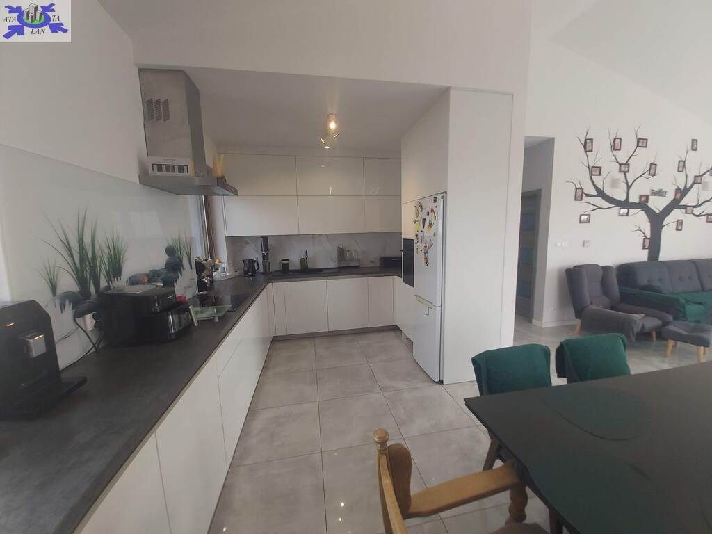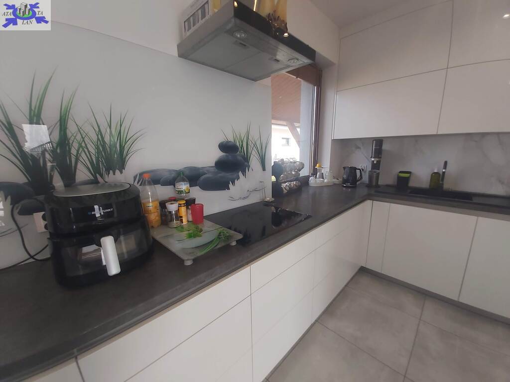 Kuchnia została zaprojektowana w zabudowie, wyposażona w sprzęty AGD, co zapewnia komfort użytkowania oraz nowoczesny wygląd.