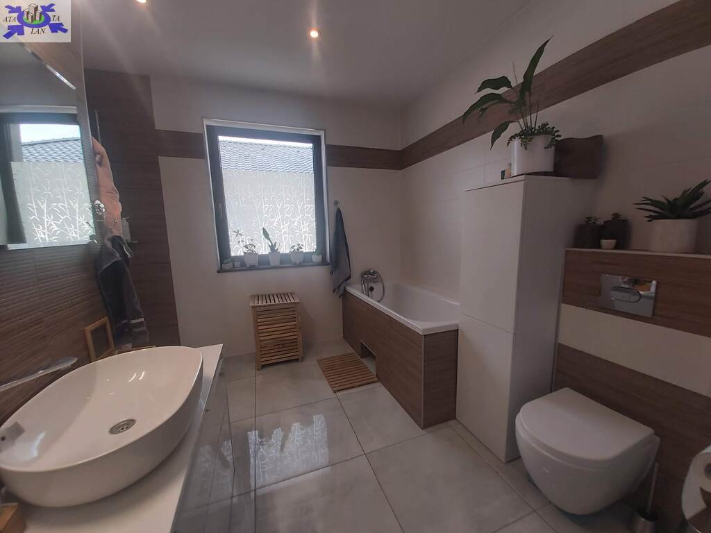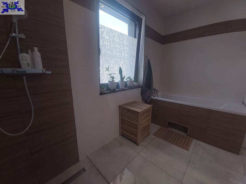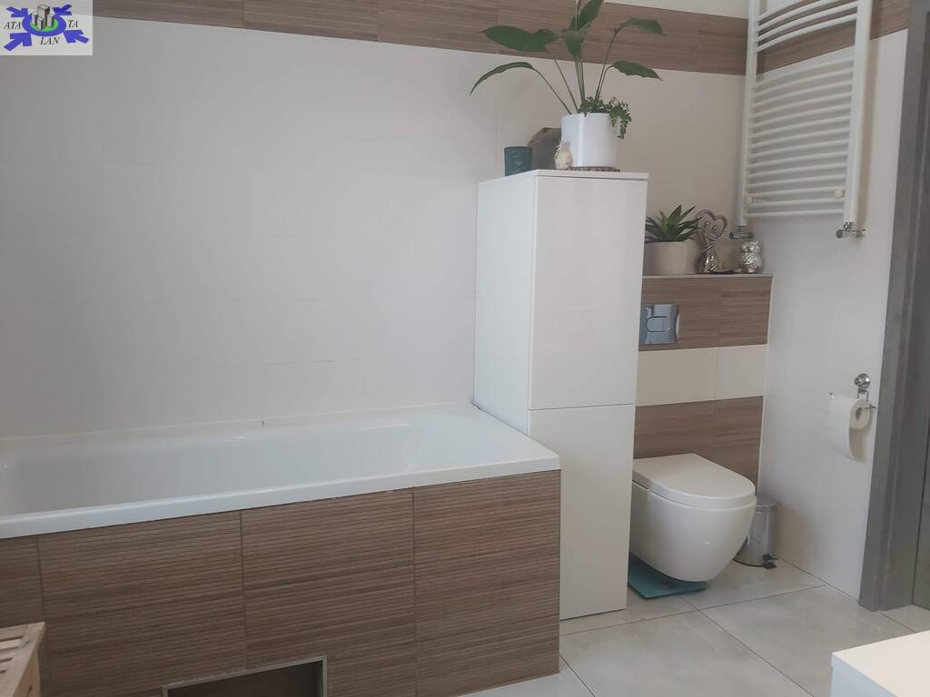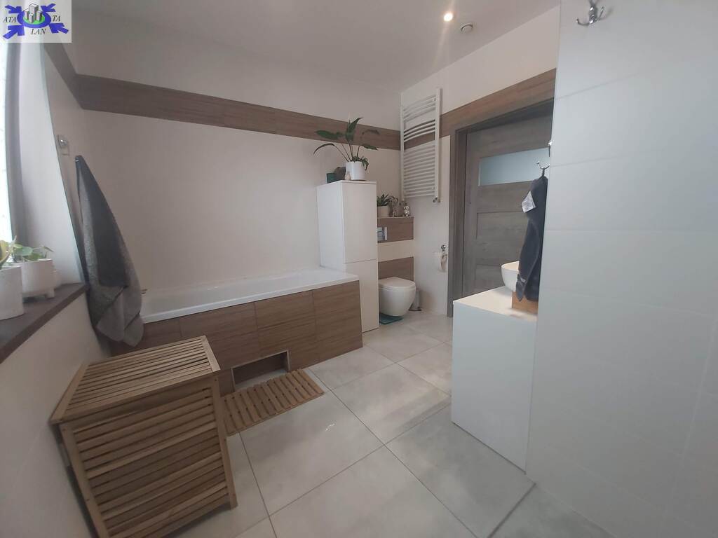 Przestronna łazienka z wc, wyposażona zarówno w wannę, jak i prysznic, co gwarantuje wygodę użytkowania.