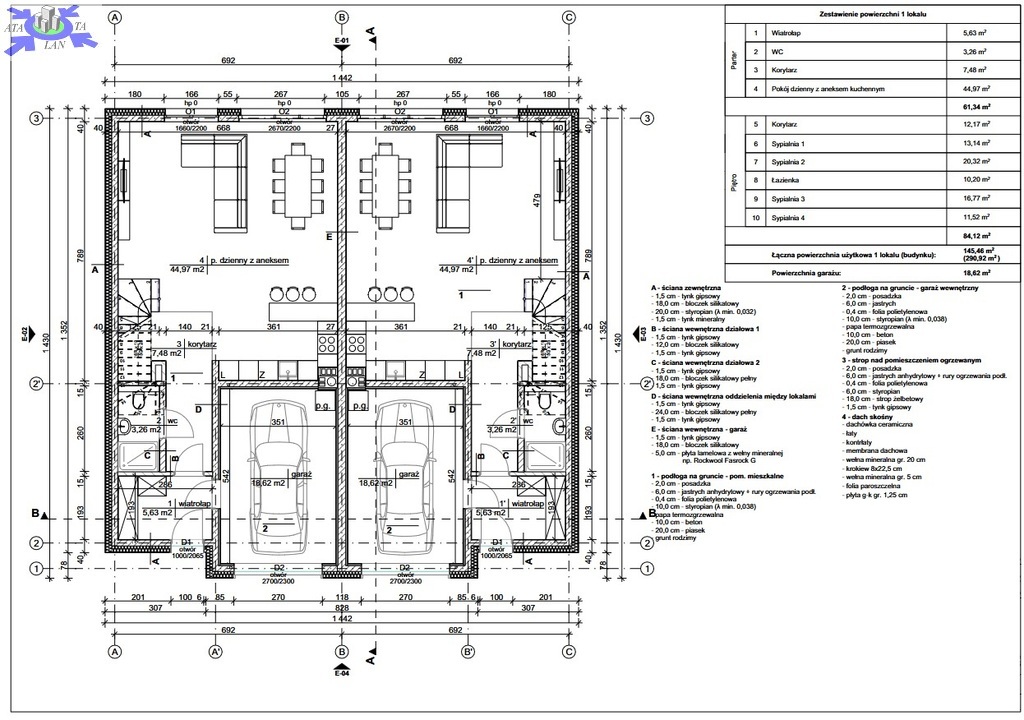 Łącznie 145,46 m2 + Garaż 18,62 m2.