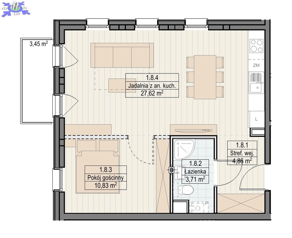 Apartament będący przedmiotem tej oferty znajduje się na piętrze i ma powierzchnię 47.28 m2. Składa się z salonu z aneksem kuchennym, sypialni, łazienki i przedpokoju.