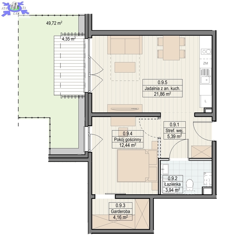 Apartament będący przedmiotem tej oferty znajduje się na parterze i ma powierzchnię 43,32 m2. Składa się z salonu z aneksem kuchennym, sypialni, garderoby, łazienki i przedpokoju.