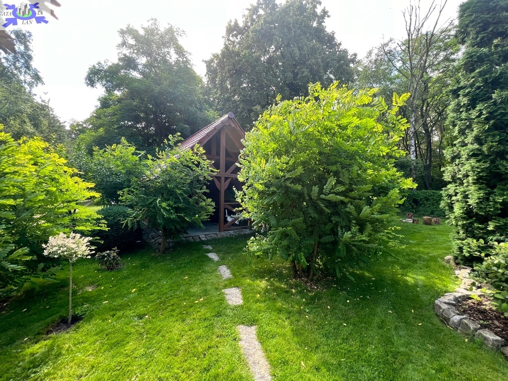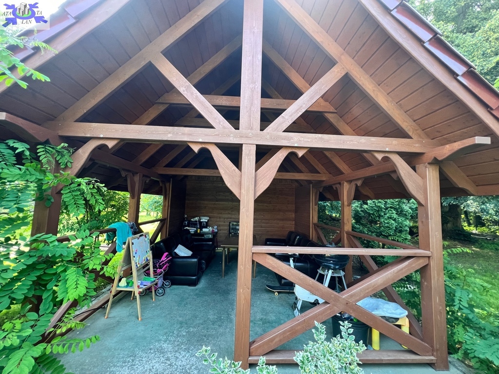 Teren w pełni zagospodarowany, z licznymi nasadzeniami i wybudowaną z drewna wiatą ogrodową idealnie nadającą się na rekreację.