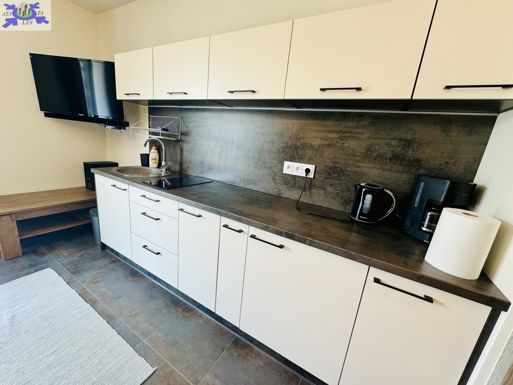 - salon z aneksem kuchennym (18 m2) i wyjściem na taras (ok. 8m2),