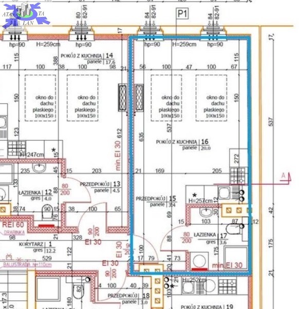 - pokój dzienny połączony z aneksem kuchennym 20,00 m2.