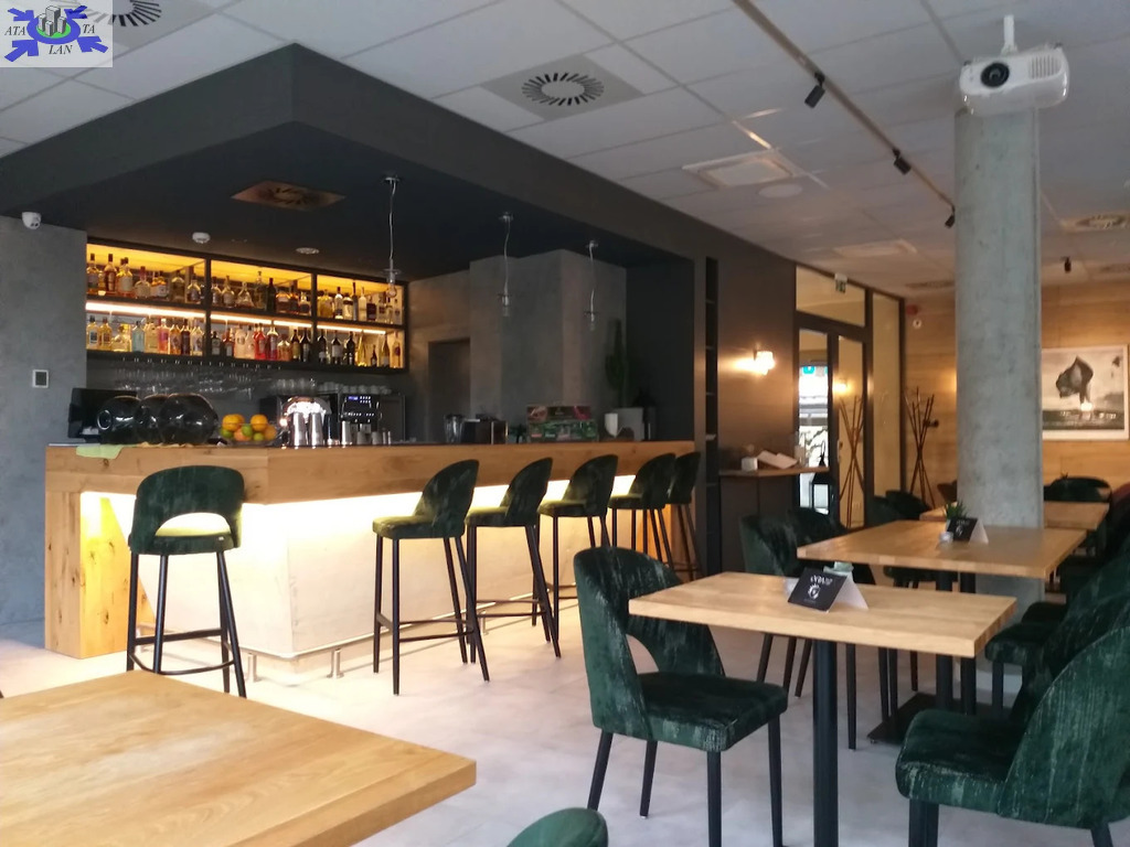 Piękna restauracja 120m2 z ogromnymi oknami z którego roztacza się widok na jezioro (kuchnia 22,10m2/zmywalnia 3,30m2/obieralnia 6,85m2/magazyn ziemny 4,20m2/ magazyn suchy 3,60m2)