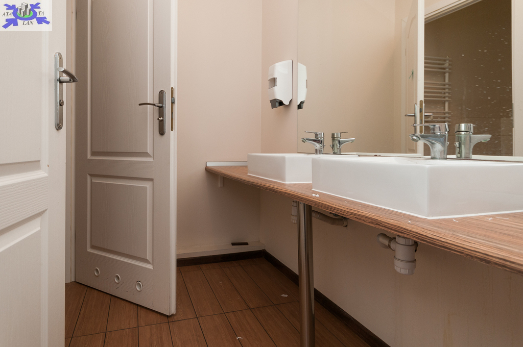 * pomieszczenie socjalne z aneksem kuchennym przez które wchodzi się do sanitariatów