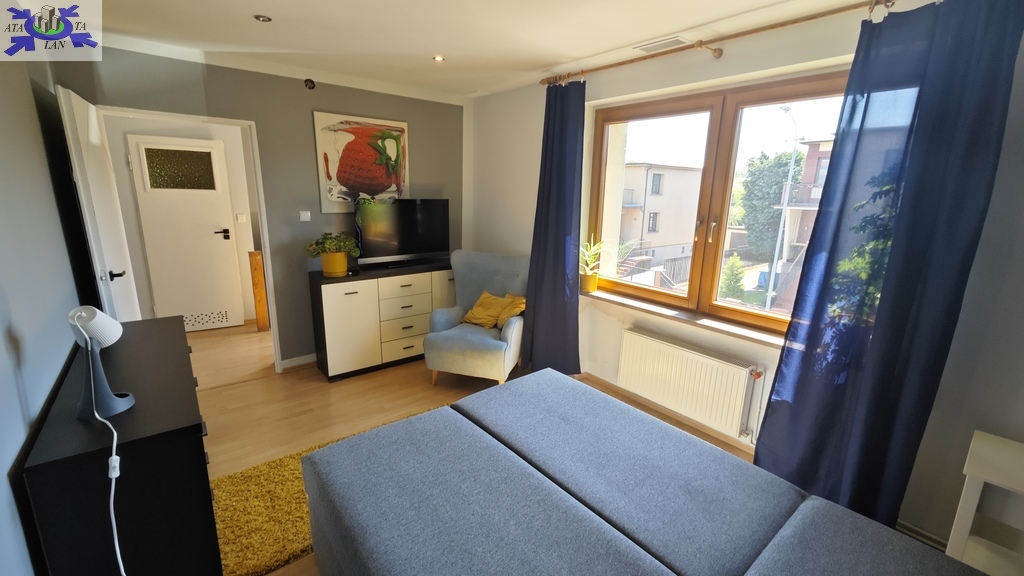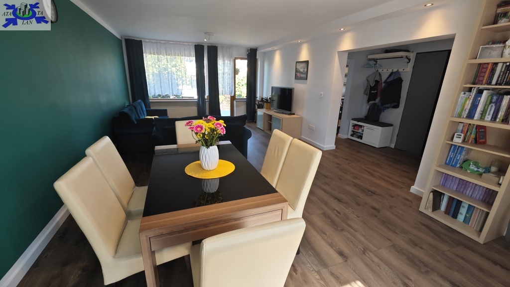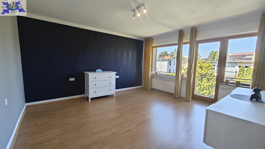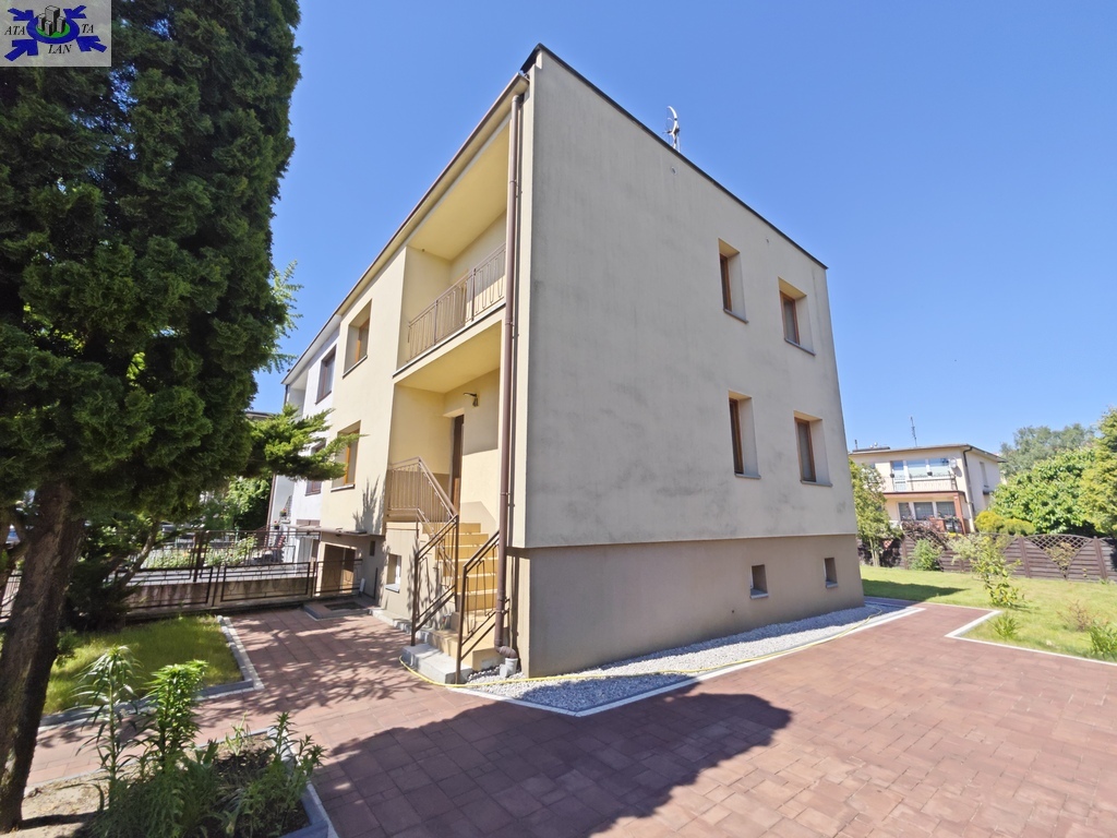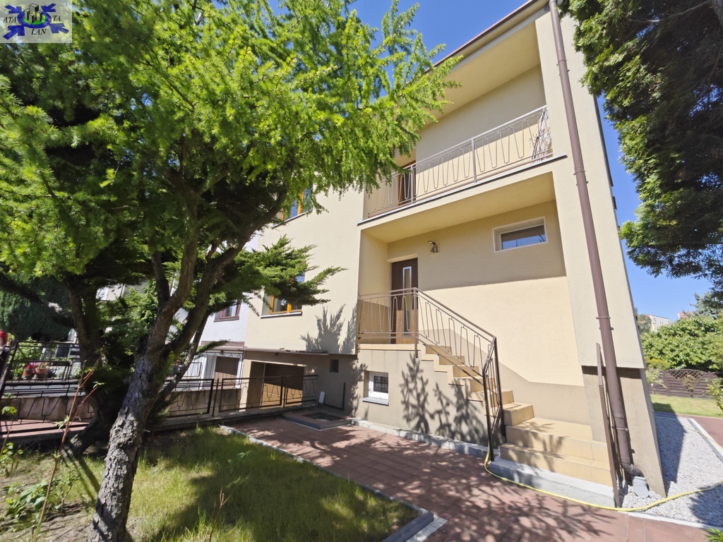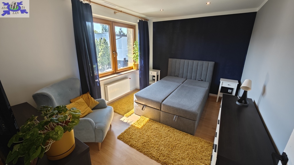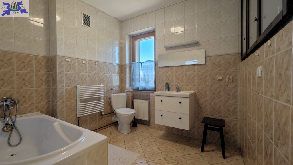 Na parterze znajduje się bardzo duży salon o powierzchni ponad 32m2 z wyjściem na taras (możliwość wykonania zejścia na ogród), osobno kuchnia 11m2 z oknem, łazienka 4m2 również z oknem, hol oraz wiatrołap. Istnieje możliwość podzielenia salonu na dwa niezależne pokoje uzyskując w ten sposób piąty pokój (np. pomniejszając salon z 32m2 do 22m2 uzyskujemy dodatkowy gabinet o powierzchni 10m2). Na górny poziom prowadzą wygodne schody (wylewka betonowa plus stopnie wykończone drewnem). Piętro to trzy niezależne pokoje (największy ponad 19m2 z wyjściem na balkon plus dwa pokoje po 12m2), kolejna łazienka prawie 6m2 z oknem oraz hol 5m2 z wyjściem na kolejny balkon. Poziom piwnicy to przede wszystkim duży garaż z nową, automatyczną bramą (łagodny zjazd do garażu), pomieszczenie z piecem gazowym II-obiegowym firmy Junkers, pomieszczenie gospodarcze oraz pomieszczenie od strony ogrodu z bezpośrednim wyjściem na ogród, gdzie właściciele przechowują narzędzia do konserwacji ogrodu (między innymi kosiarkę do trawy).