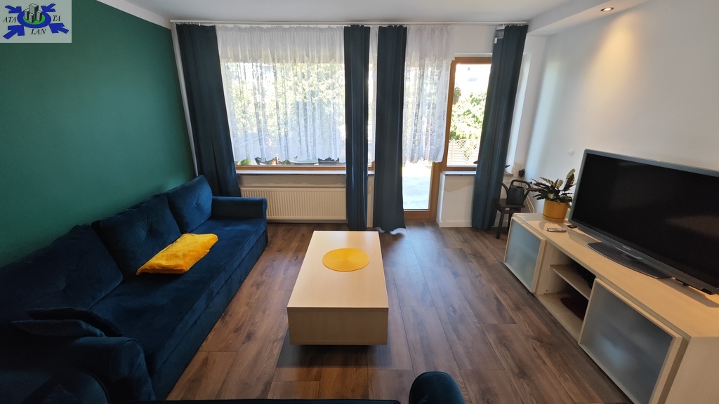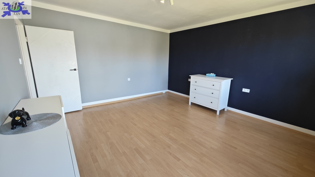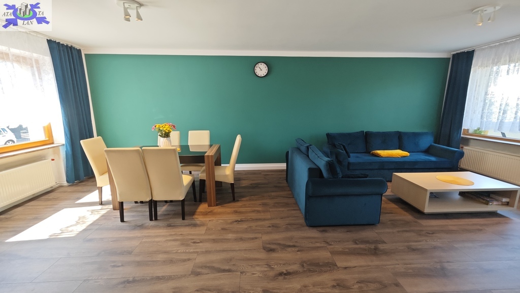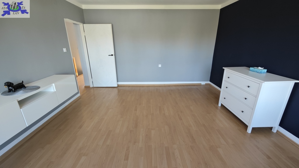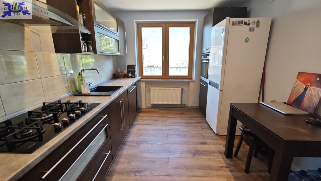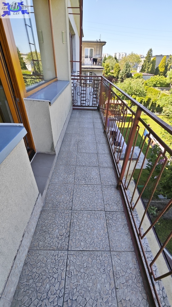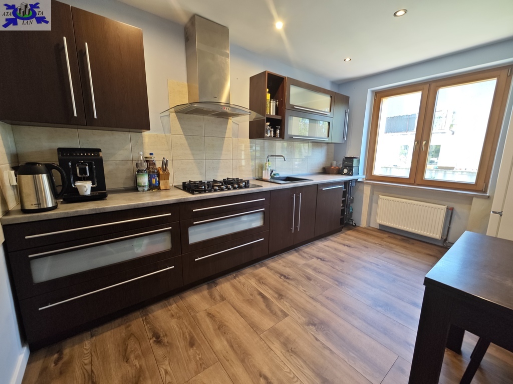 Na parterze znajduje się bardzo duży salon o powierzchni ponad 32m2 z wyjściem na taras (możliwość wykonania zejścia na ogród), osobno kuchnia 11m2 z oknem, łazienka 4m2 również z oknem, hol oraz wiatrołap. Istnieje możliwość podzielenia salonu na dwa niezależne pokoje uzyskując w ten sposób piąty pokój (np. pomniejszając salon z 32m2 do 22m2 uzyskujemy dodatkowy gabinet o powierzchni 10m2). Na górny poziom prowadzą wygodne schody (wylewka betonowa plus stopnie wykończone drewnem). Piętro to trzy niezależne pokoje (największy ponad 19m2 z wyjściem na balkon plus dwa pokoje po 12m2), kolejna łazienka prawie 6m2 z oknem oraz hol 5m2 z wyjściem na kolejny balkon. Poziom piwnicy to przede wszystkim duży garaż z nową, automatyczną bramą (łagodny zjazd do garażu), pomieszczenie z piecem gazowym II-obiegowym firmy Junkers, pomieszczenie gospodarcze oraz pomieszczenie od strony ogrodu z bezpośrednim wyjściem na ogród, gdzie właściciele przechowują narzędzia do konserwacji ogrodu (między innymi kosiarkę do trawy).