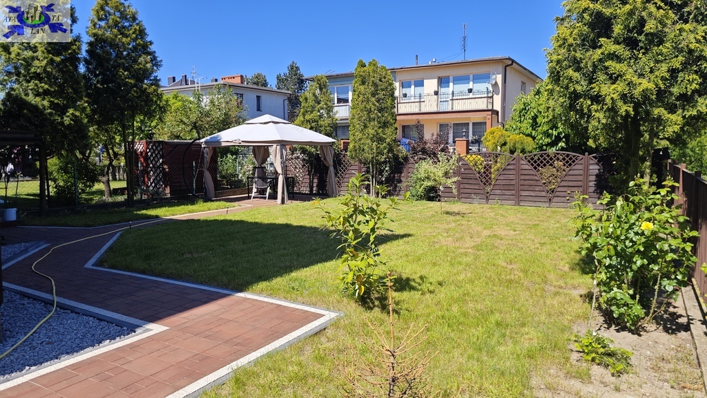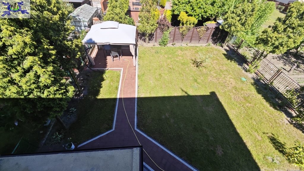 Niewątpliwym atutem nieruchomości jest ładnie zagospodarowany ogród (mniejsza część znajduje się od strony ulicy, zaś główny ogród znajduje się na tyłach nieruchomości). Ogród jest przede wszystkim pokryty ładnie utrzymanym trawnikiem z alejkami wyłożonymi polbrukiem plus nieliczne drzewka (wierzba oraz dwie wiśnie) i dodatkowo miejsce do wypoczynku pod rozstawianym namiotem. Ogródek jest bardzo słoneczny. Poza garażem w bryle budynku - na posesję można wjechać przez drugą bramę wjazdową, aby zaparkować dwa kolejne samochody (przed posesją kolejne dwa miejsca postojowe).
