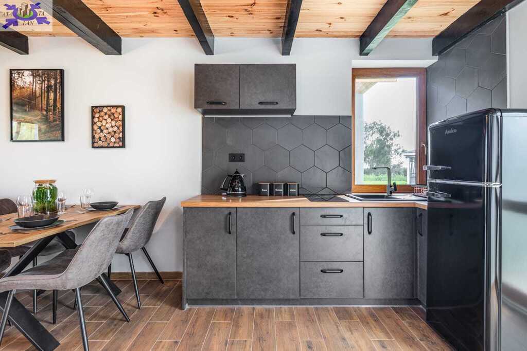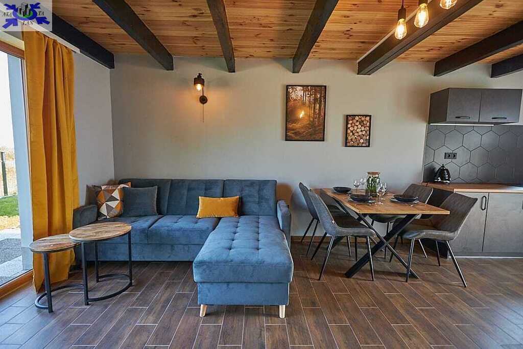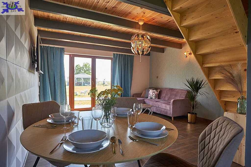 Parter otwarta przestrzeń dzienna z kuchnią, częścią jadalną i wypoczynkową oraz łazienka z kabiną prysznicową. Rozkładana sofa pozwala na zakwaterowanie dodatkowych osób