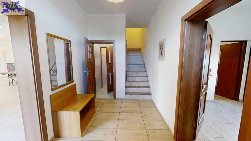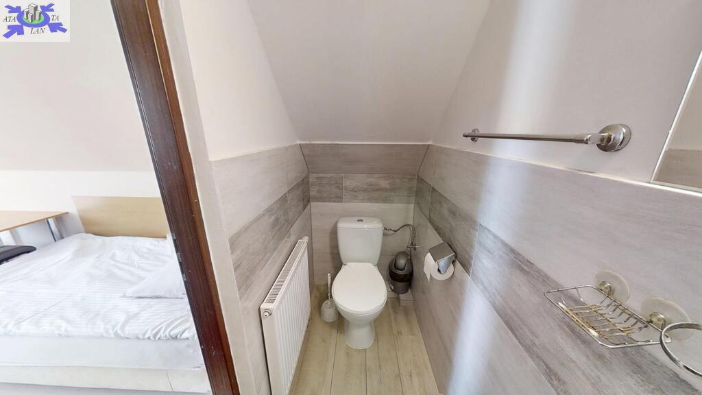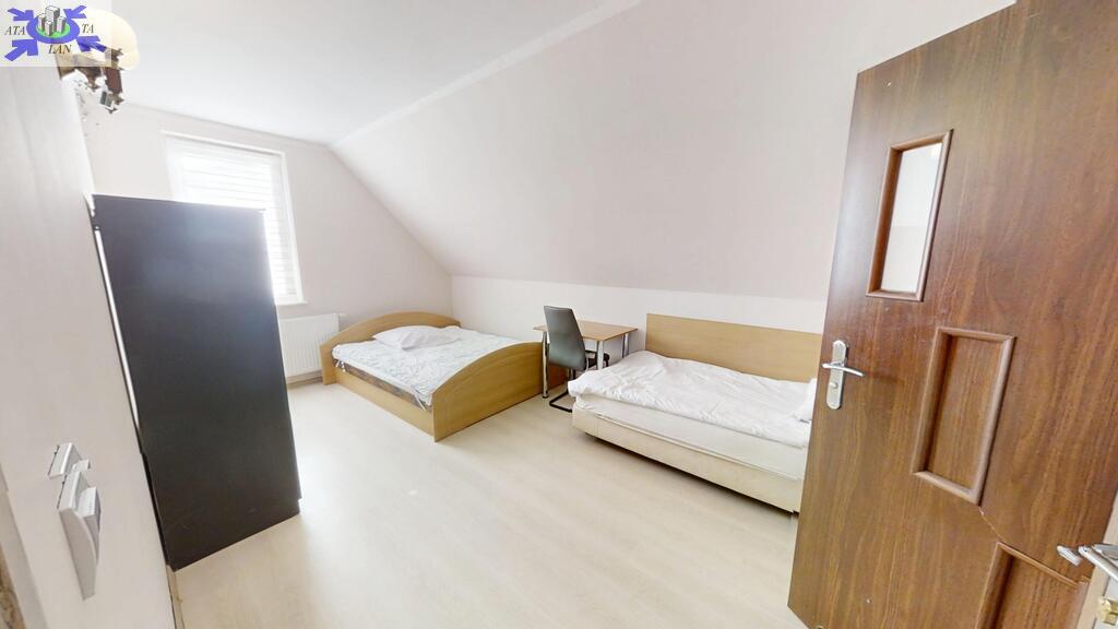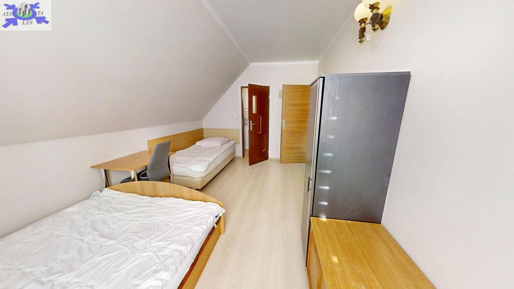 Na poddaszu - 128 m2, hol, 6 osobnych umeblowanych pokoi, każdy z łazienką.