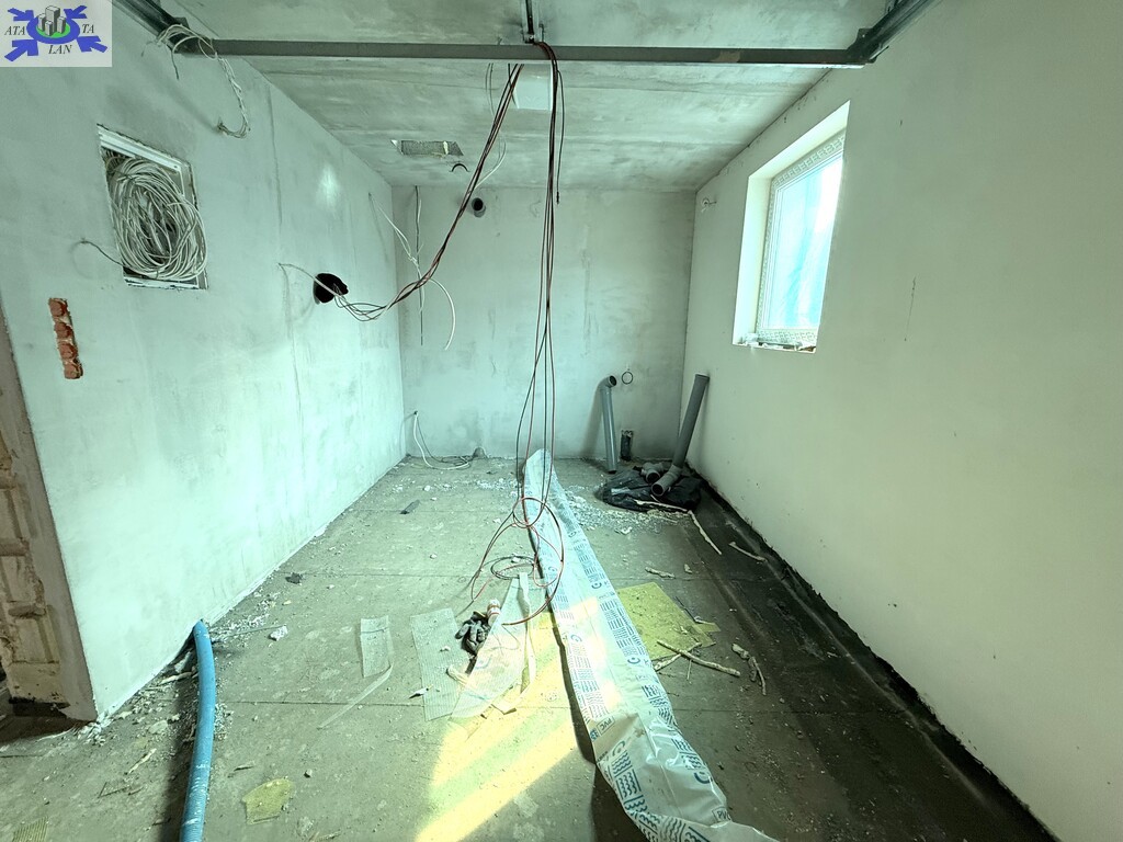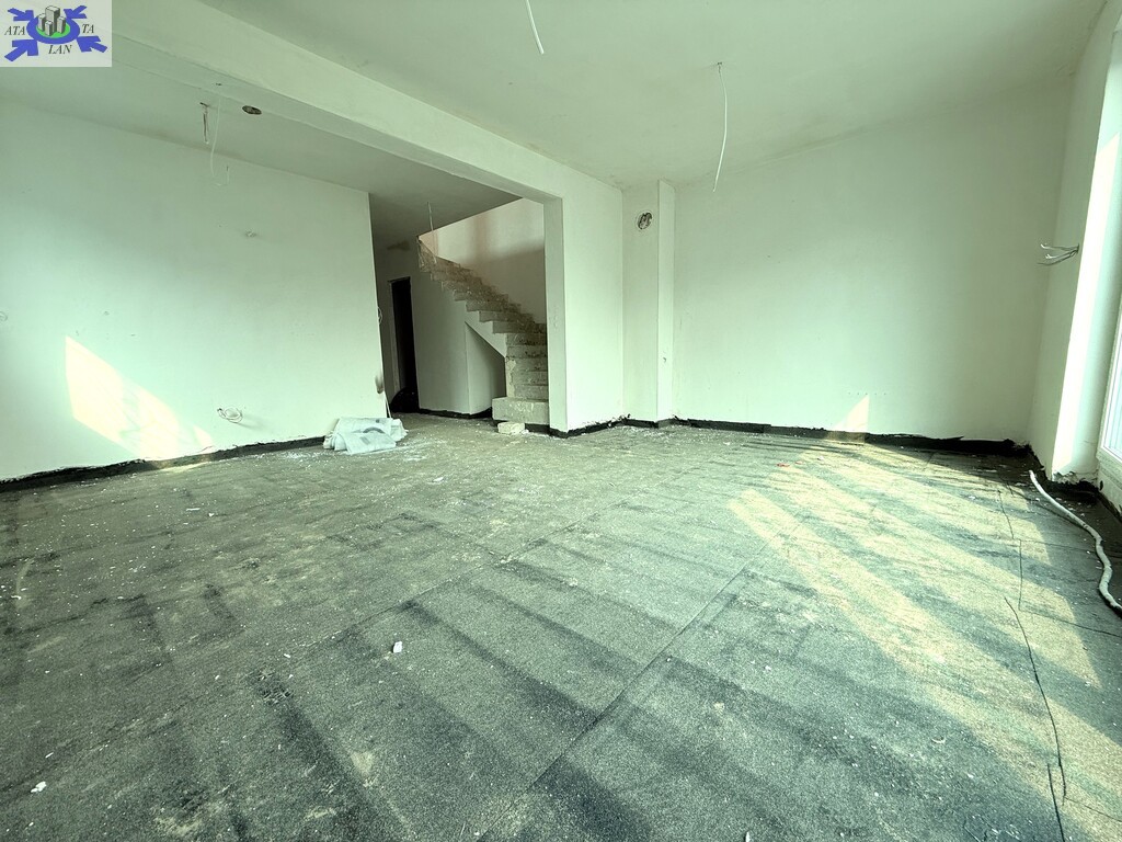 Parter salon z aneksem kuchennym, przedsionek, łazienka oraz garaż. Na piętrze cztery pokoje, łazienka, korytarz.