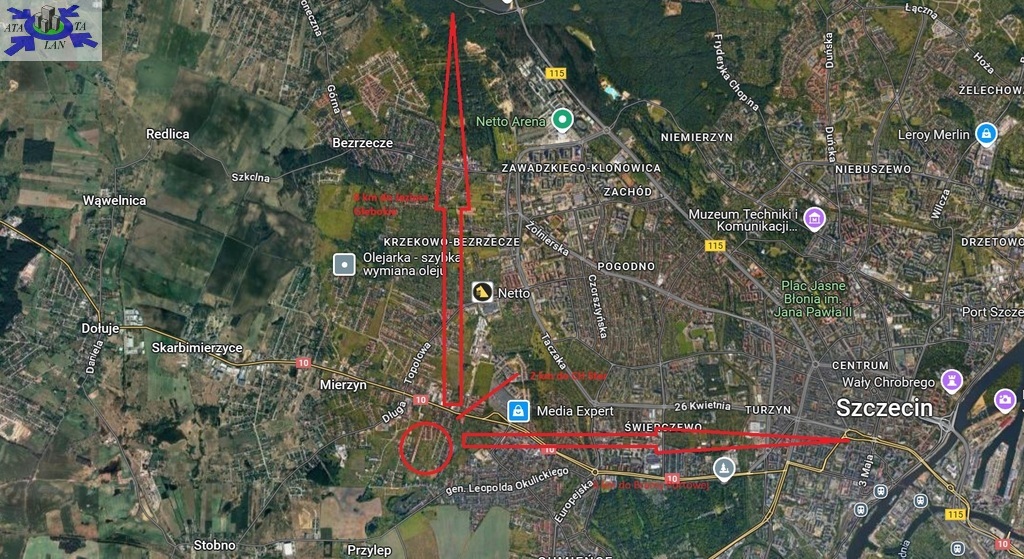 Kompleks 62 działek na sprzedaż znajduje się na granicy Mierzyna oraz Szczecina przy osiedlu Gumieńce, w dzielnicy willowej zabudowanej domami jednorodzinnymi oraz blokami wielorodzinnymi. Na nieruchomość składają się działki przygotowane pod zabudowę mieszkaniową oraz działka drogowa zapewniająca dojazd do wszystkich działek w kompleksie a także dostęp do infrastruktury technicznej. Część działki drogowej została wykonana z podbudowy betonowej pod nawierzchnię asfaltową wraz z sieciami wodociągową, kanalizacji sanitarnej oraz gazowej i elektrycznej. Działka od strony zachodniej graniczy z terenem niezabudowanym oraz z zabudowanymi działkami domami jednorodzinnymi. Od strony południowej tereny niezabudowane oraz zabudowa jednorodzinna.