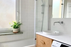 Łazienka z wanną z osłoną prysznicową, umywalką pralka