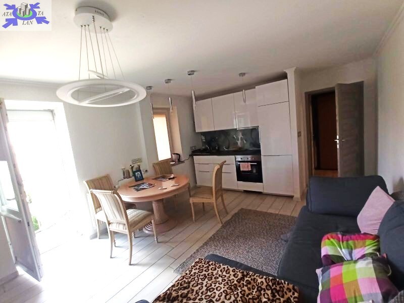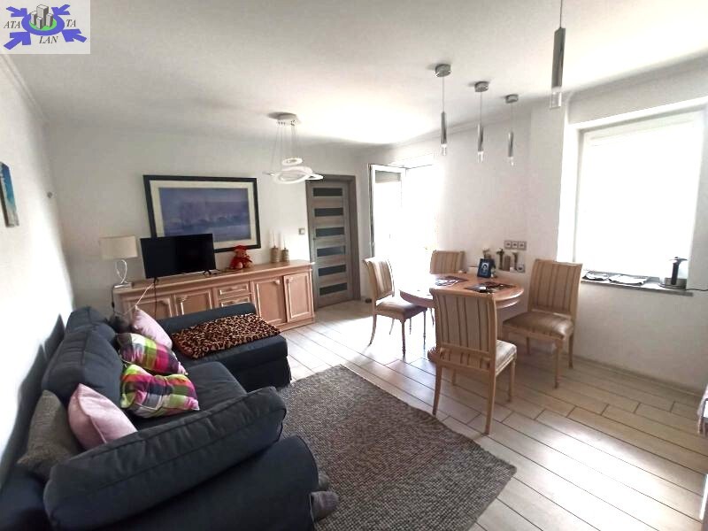 Na powierzchni ok 44m2 znajduje się duży salon z aneksem kuchennym z którego jest wyjście na obszerny balkon ciągnący się przez długość mieszkania, sypialnia, przedpokój z szafą typu komandor oraz łazienka z wc. Na podłodze w całym mieszkaniu położono terakotę, ściany malowane, okna PCV, 3 szybowe, z zewnętrznymi żaluzjami automatycznymi i wewnętrznymi roletami.