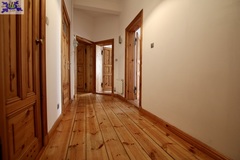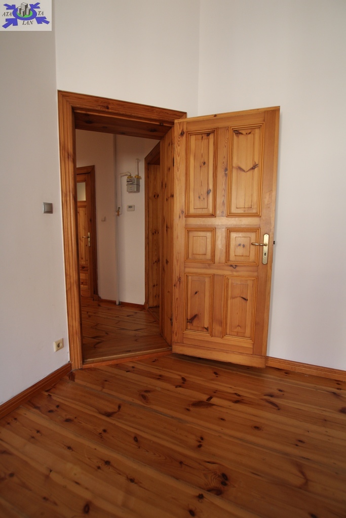 Stylowe wykończenie - oryginalne drewniane drzwi po renowacji, deski na podłogach, a w kuchni i garderobie nowoczesne panele.