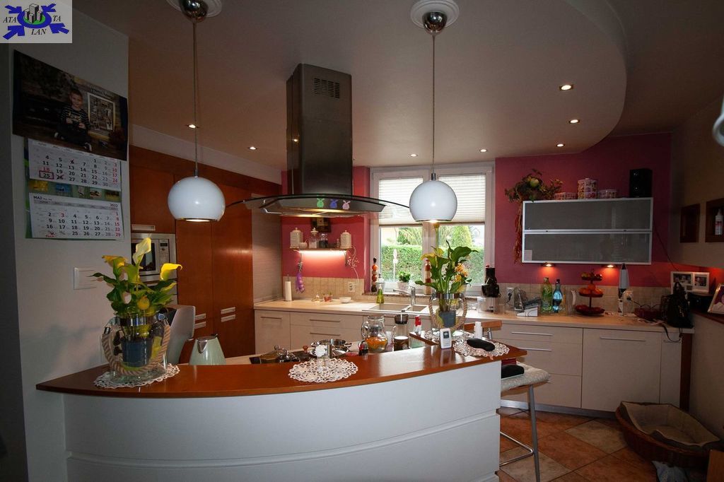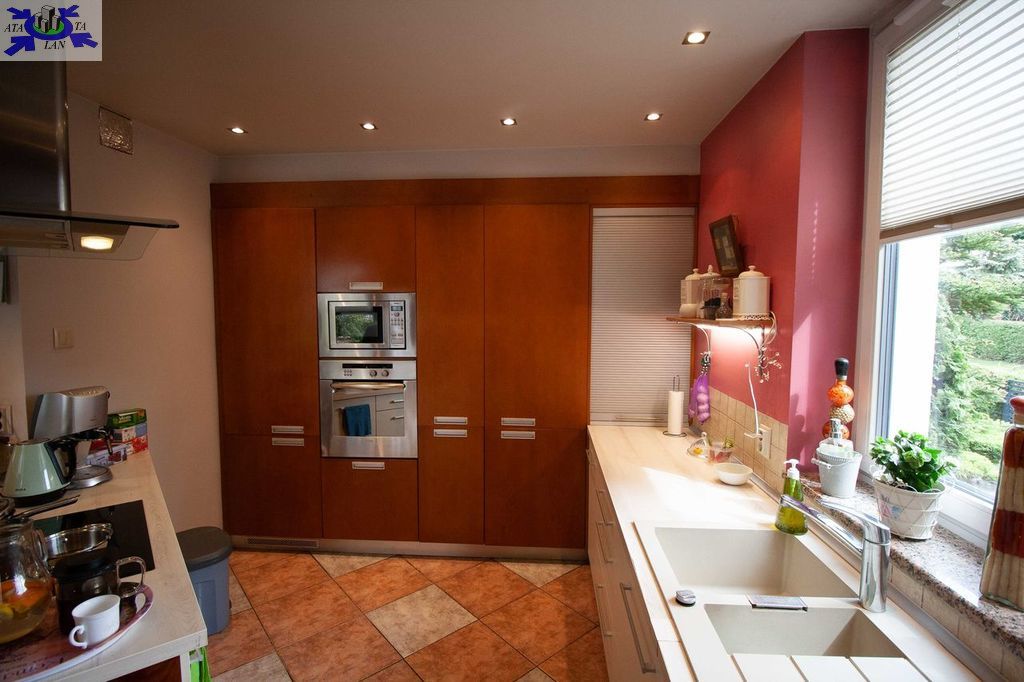 - PARTER - 119,9 m2. Na tym poziomie zlokalizowany jest pokój dzienny 45 m2 z kominkiem otwarty na widną kuchnię - 15,4 m2 z jadalnią - 8,5 m2. Z salonu jest wyjście na 10 metrowy taras i dalej na ogród. Na podłodze kafle, sufity podwieszane z punktowym oświetleniem. Poza tym na poziomie parteru mamy pokój pełniący funkcję garderoby - 10,5 m2, łazienkę z WC, holl - 23 m2. Kuchnia z zabudową meblową robioną na wymiar wraz wyposażeniem może pozostać w cenie nieruchomości.