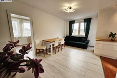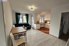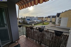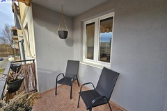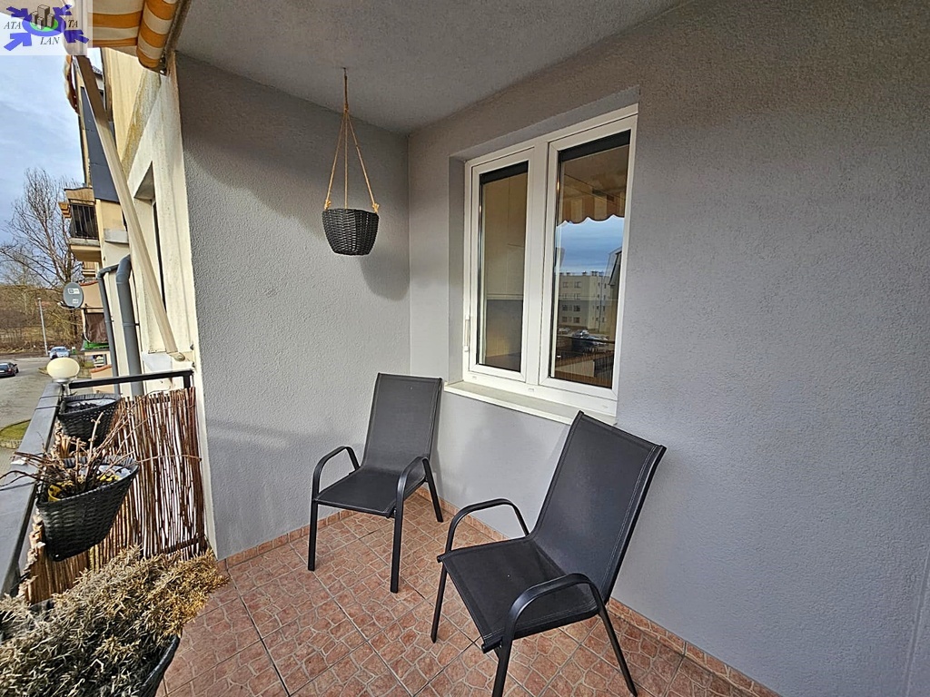 Z salonu jest wyjście na przestronny balkon wyposażony w zamontowaną markizę chroniącą latem przed słońcem.