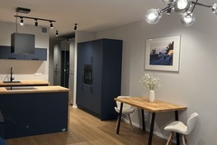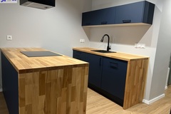 - Salon z aneksem kuchennym - nowoczesna zabudowa z drewnianymi blatami, sprzęt AGD i lodówka w cenie