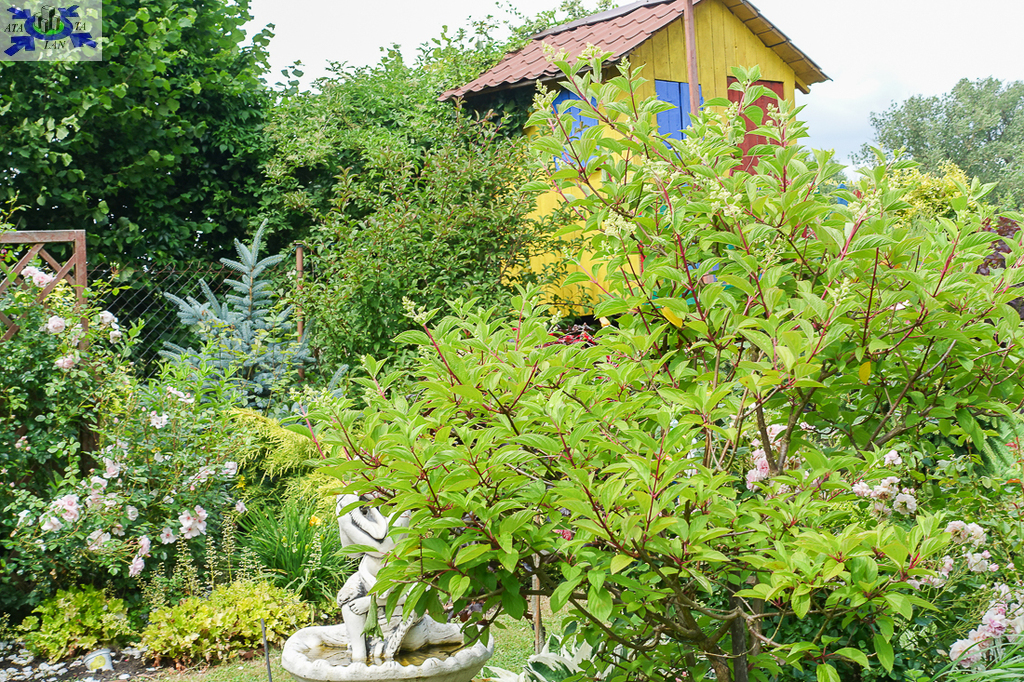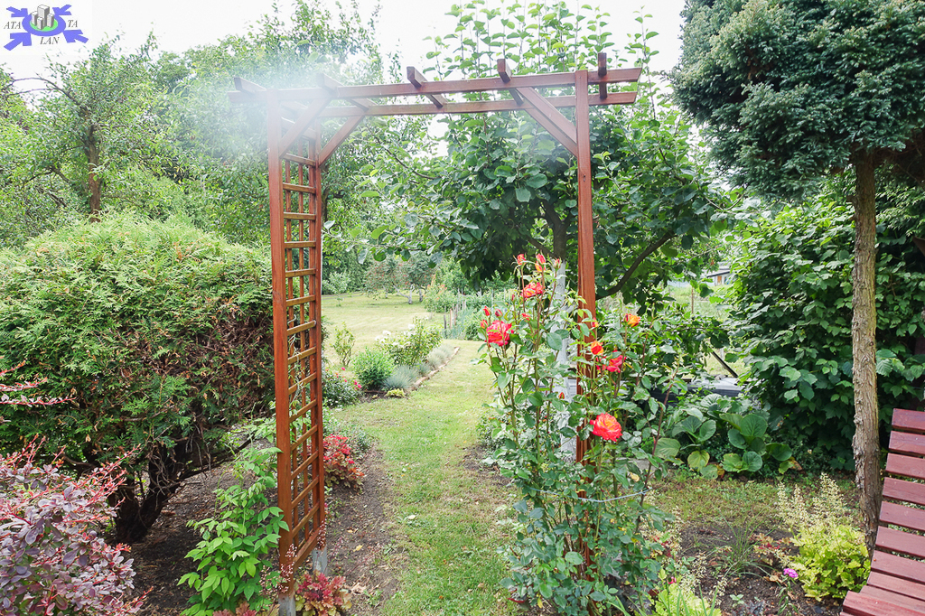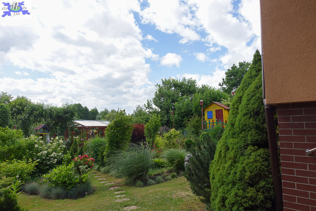 OPIS TERENU działka 3340 m2, możliwość postawienia drugiego domu, ponadto nowa altana drewniana z tarasem, domek dla dzieci, duża ilość pięknych krzewów i nasadzeń, kwiatów wieloletnich, sad owocowy z jabłoniami, wiśniami, czereśniami, warzywniak, mała fontanna, pomieszczenie gospodarcze, 2 garaże o wysokości 2 m, jeden o powierzchni 12,5 m2, drugi 9 m2 każdy o długości 5 m i wysokości w najniższym punkcie 2 m. Nad garażami zagospodarowany strych.