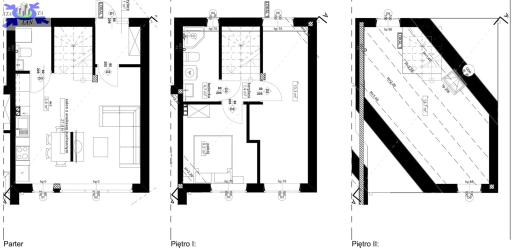 II Poziom - 2 sypialnie o pow. ok 9.5 m2 i 13, 5 m2, łazienka oraz korytarz