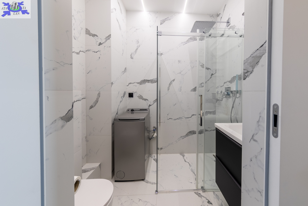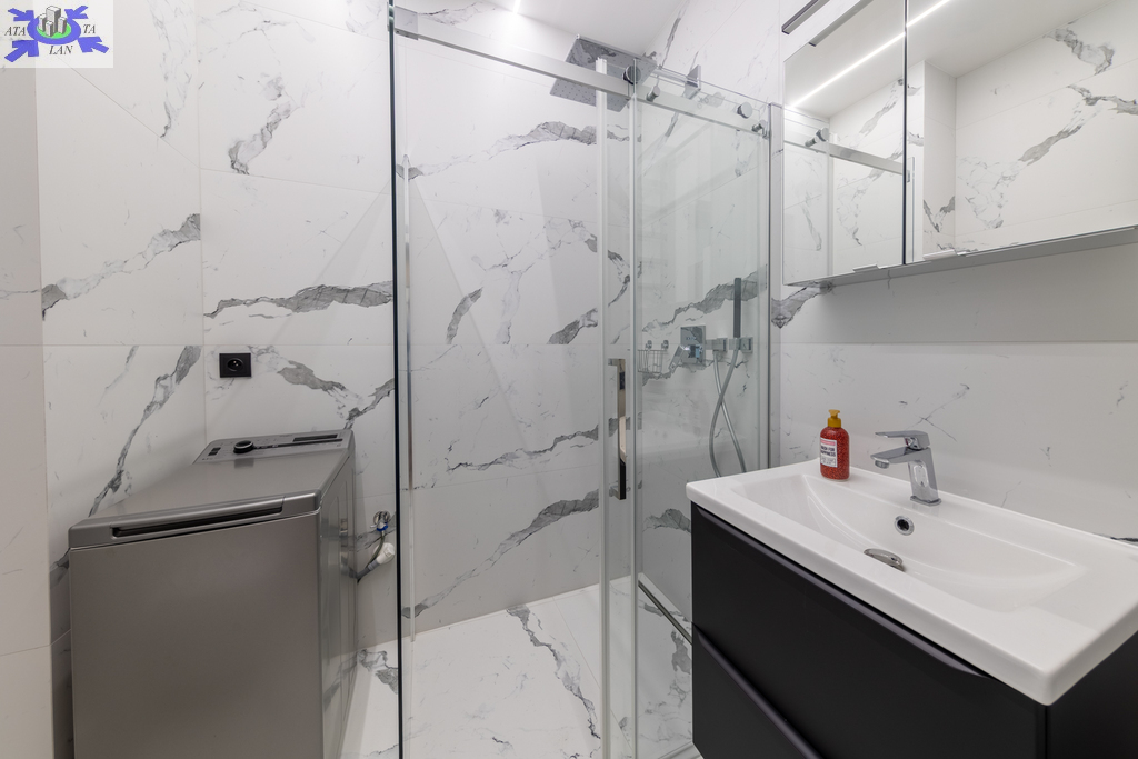 - stylowa łazienka wykończona szkliwionym gresem imitującym biały marmur, z kabiną prysznicową, umywalką, toaletą oraz nową pralką.