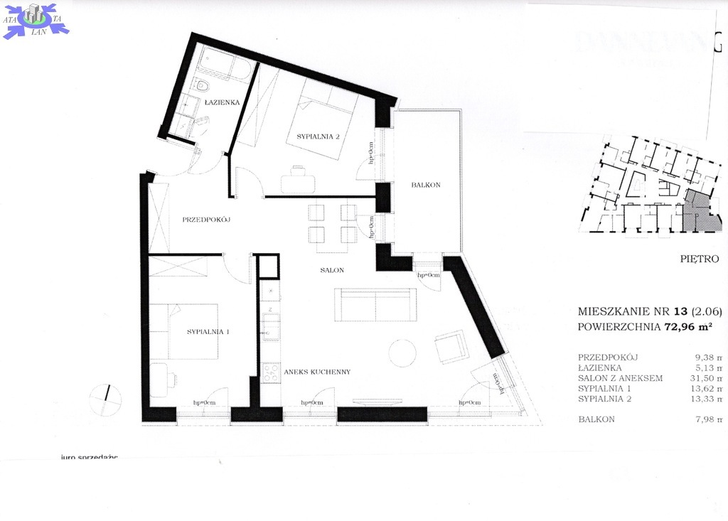 OPIS MIESZKANIA mieszkanie 3 pokojowe o powierzchni 72,96 m2, z wyjściem na balkon o powierzchni 7,98 m2. Pokój z aneksem kuchennym o powierzchni 31,5 m2, sypialnia 13,62 m2 i 13,33 łazienka 5,13 m2, przedpokój 9,38 m2. Balkon od strony wschodniej o powierzchni 7,98 m2. I piętro w V piętrowym budynku z windą. Wystawa okien południowo- wschodnia.