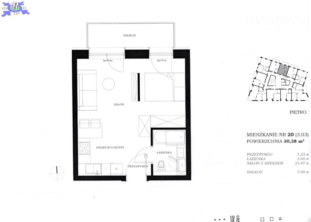 OPIS MIESZKANIA mieszkanie 1 pokojowe o powierzchni 30,38 m2, z wyjściem na balkon o powierzchni 5 m2. Pokój z aneksem kuchennym o powierzchni 23,47 m2, łazienka 3,68 m2, przedpokój 3,23 m2. Balkon od strony północnej o powierzchni 5 m2. II piętro w V piętrowym budynku z windą. Wystawa okien północno - wschodnia.