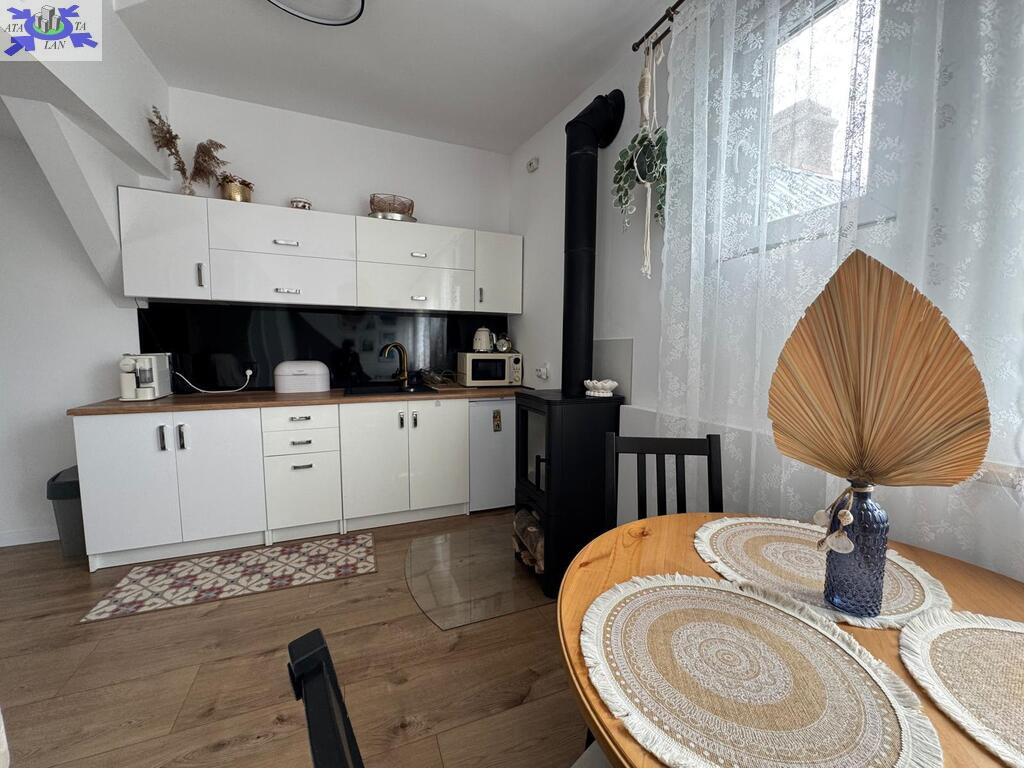 W kuchni znajduje się urokliwy kominek, który dodaje niepowtarzalnego klimatu, a także zapewnia ciepło w chłodniejsze dni.