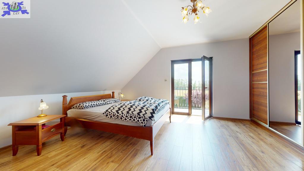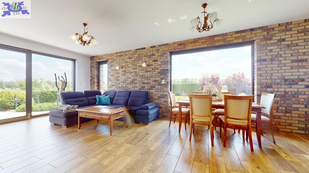 Budynek parterowy z poddaszem użytkowym wykonany w technologii tradycyjnej. Od strony ogrodowej zadaszony taras, przy bocznej elewacji wiata na samochód. Na łączną pow. użytkową 141,2 m2 składają się