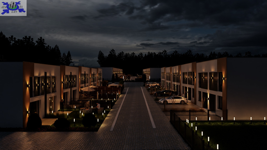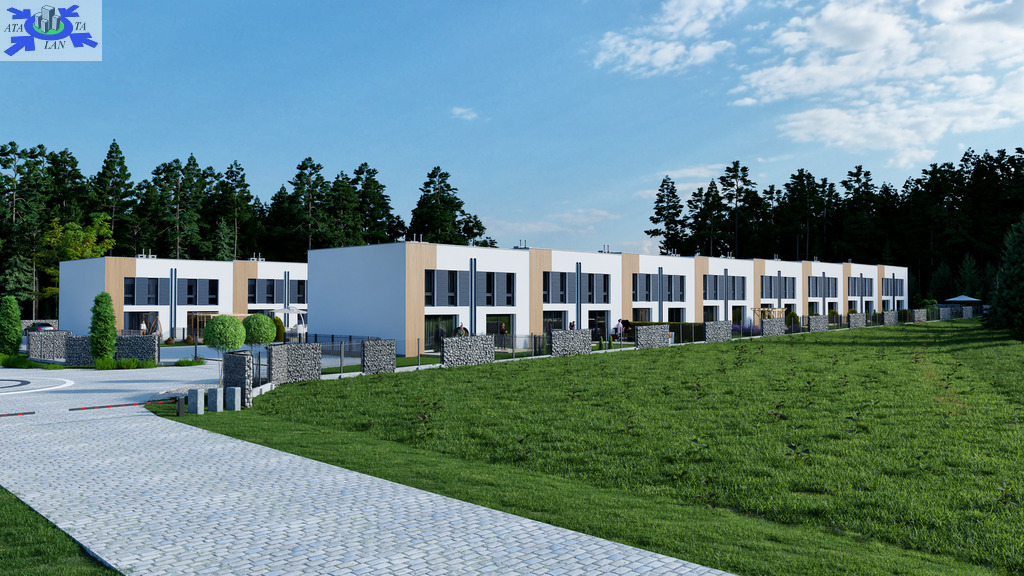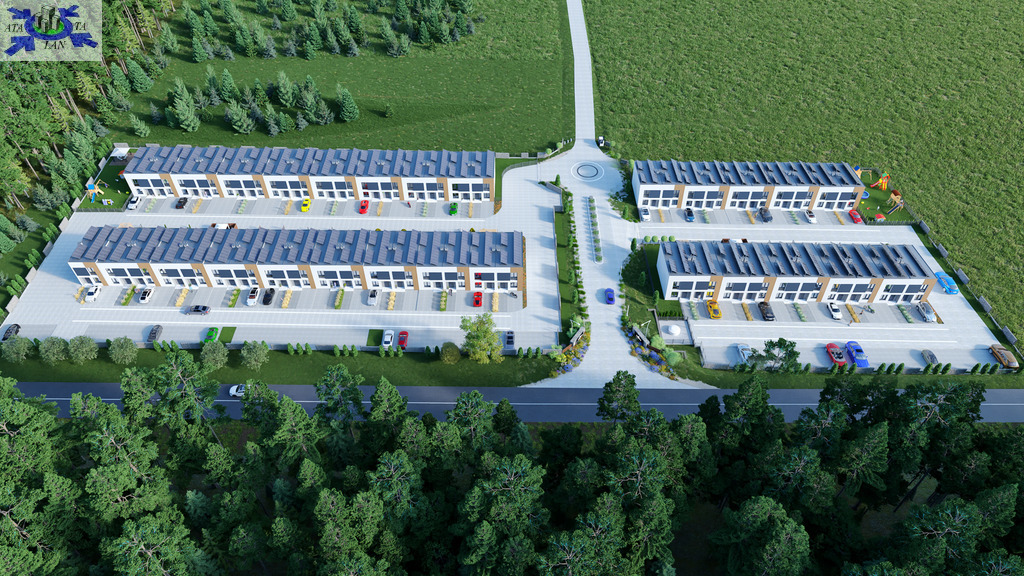 - Do każdego domu przynależne 2 miejsca parkingowe, jedno przed budynkiem a drugie przy granicy z działką drogową, Nowa inwestycja, osiedle budynków mieszkalnych jednorodzinnych w zabudowie szeregowej.