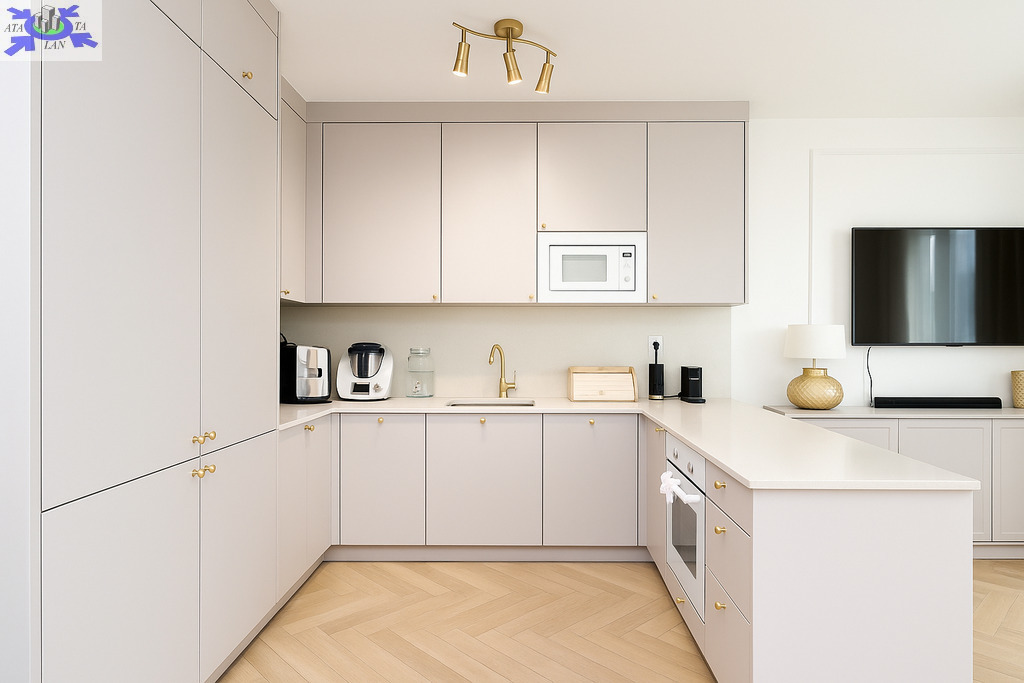 -Kuchnia w kolorze kaszmiru ze złotymi dodatkami - w pełni wyposażona, meble w zabudowie pod wymiar