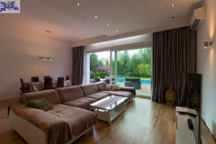 Szerokie, przesuwne okna tarasowe typu HST zapewniają doskonałe doświetlenie wnętrza oraz płynne połączenie salonu z zielonym otoczeniem, prowadzą bezpośrednio na duży taras z murowanym basenem (o wymiarach 9m długość x 4m szerokość i głębokość 1,5 m) oraz piękny kilkunastoletni ogród.