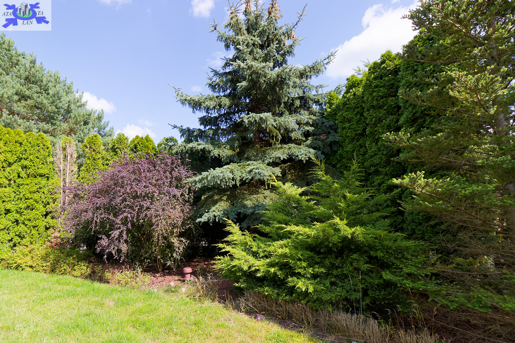 Cała działka otoczona żywopłotem z 16-letnich drzew i krzaków, różnych roślin staranie zaprojektowanych.