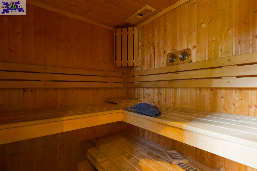 Nowoczesna łazienka z prysznicem i trzyosobową sauną.