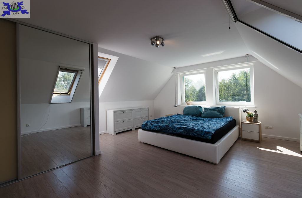 Pietro sypialnia główna o powierzchni 27,5 m2 wyposażona jest w duże, komfortowe łóżko oraz pojemną szafę w zabudowie.
