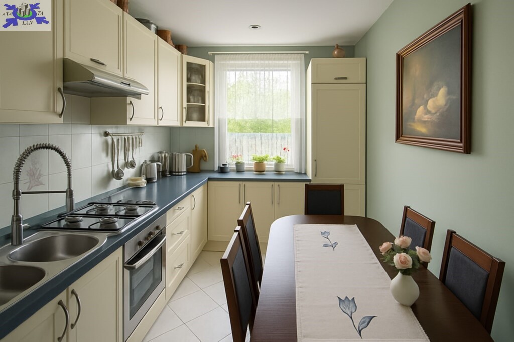 Kuchnia z zabudową i pełnym wyposażeniem piekarnik, płyta gazowa, kuchenka elektryczna, okap, lodówka