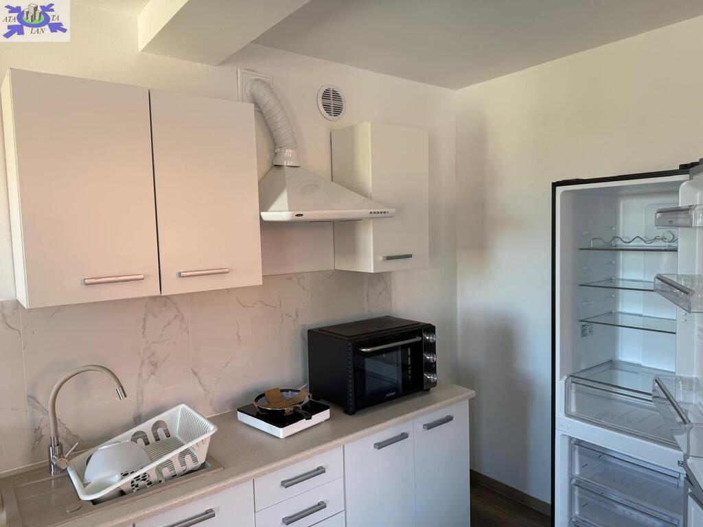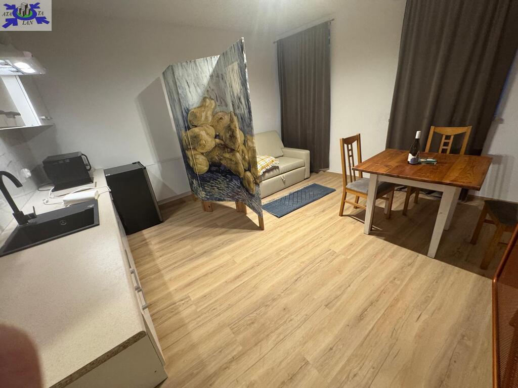 Jedno nowoczesne mieszkanie jednopokojowe z aneksem kuchennym.