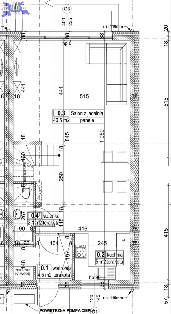 - ściany konstrukcyjne murowane, ocieplone styropianem 20 cm.