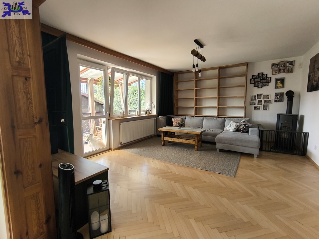 Salon (22 m2) - jasny i przytulny, z kominkiem, dębowym parkietem i wyjściem na taras