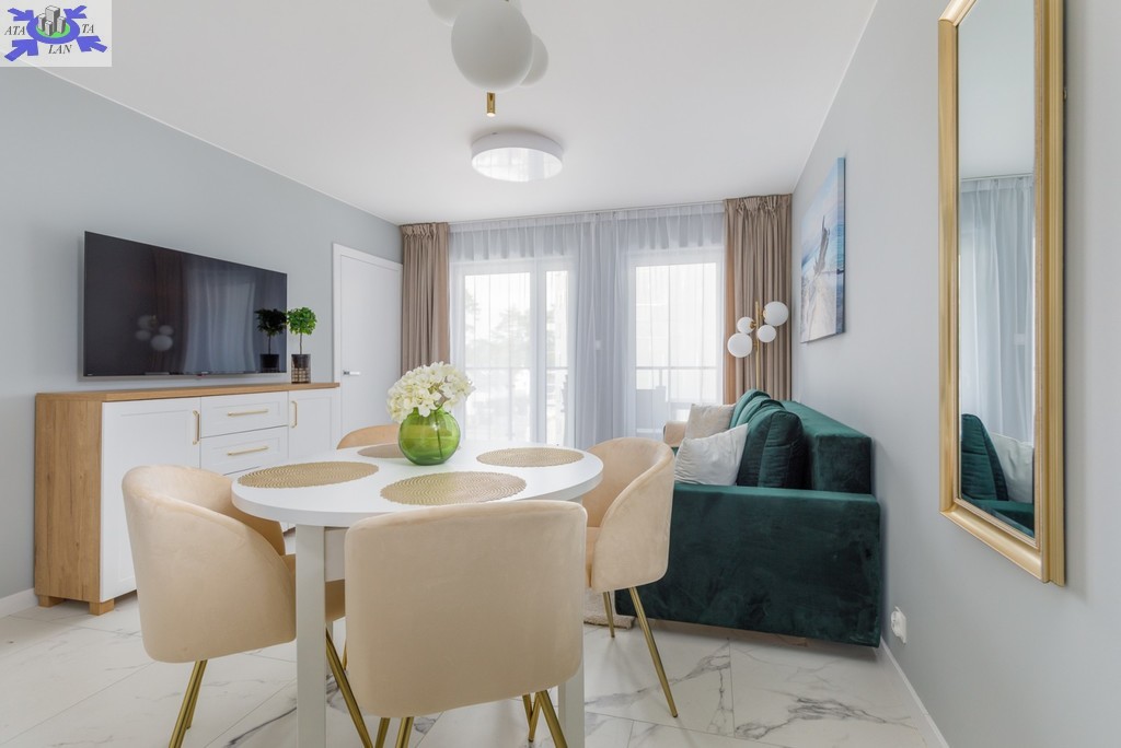 Ten znakomicie zlokalizowany apartament stanowi idealne połączenie przytulnego mieszkania i wygody nadmorskiego kurortu.