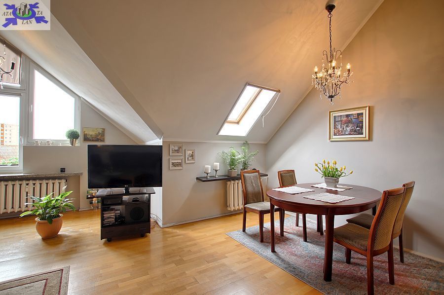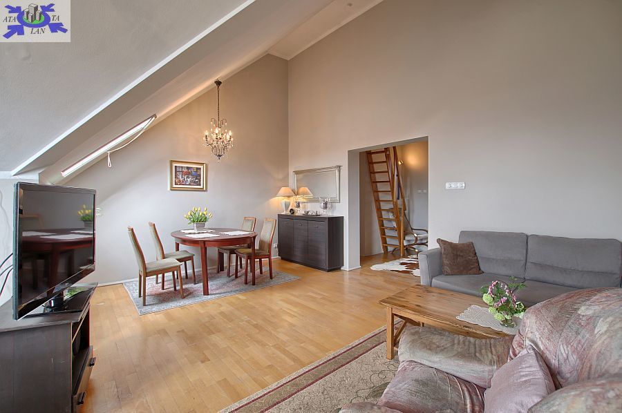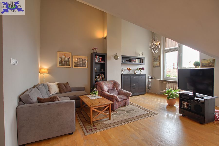 Mieszkanie jest bardzo słoneczne, jasne i ciepłe z przestronnym salonem , który w najwyższym punkcie ma 5 m wysokości, dwiema dużymi sypialniami, odrębną kuchnią , holem i łazienką razem z wc. oraz pomieszczeniem w którym może powstać dodatkowe wc (wykonano podłączenia) lub garderoba. Nad częścią mieszkania znajduje się antresola.