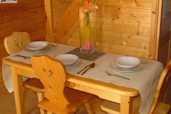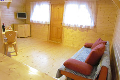 Domki drewniane to 6 osobowe, piętrowe "bliźniaki". Połączone tylnymi ścianami z wejściami po przeciwnych stronach, każda z części posiada balkon. Przed wejściem do każdego domku jest ogródek z meblami ogrodowymi (stół i 2 ławki) ogrodzony pergolami. Domek w całości wykonany jest z drewna.