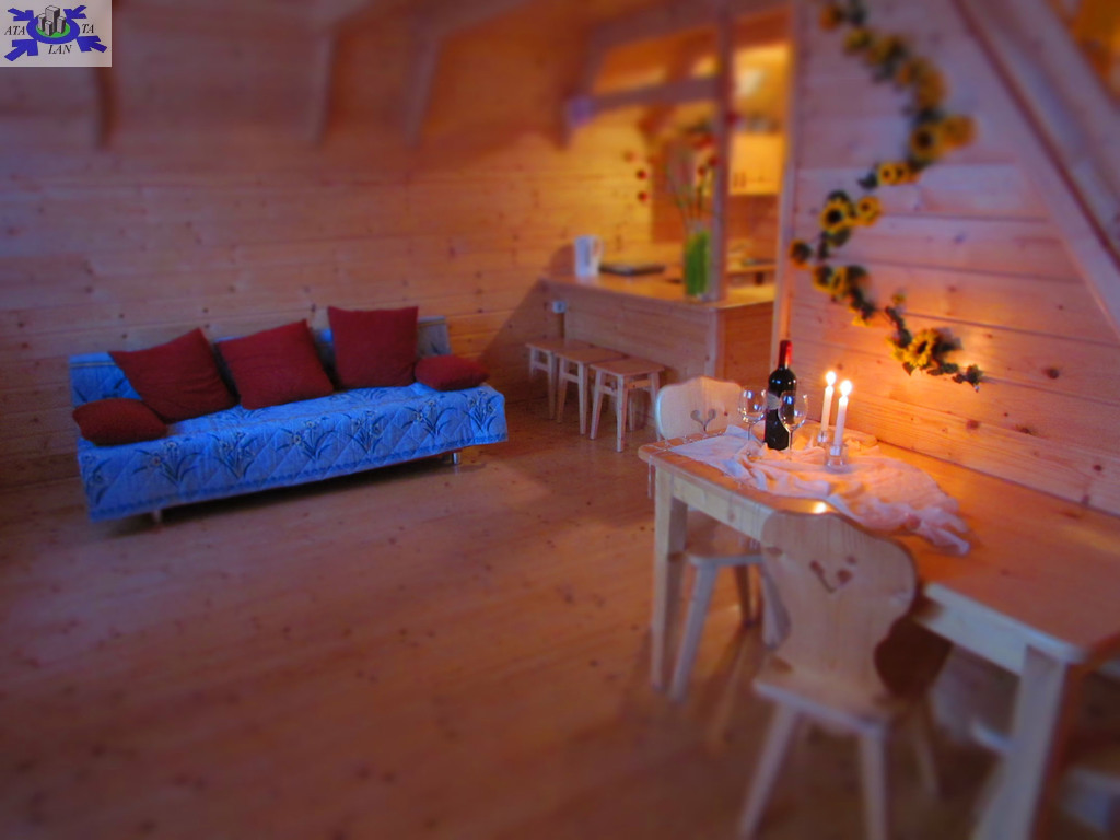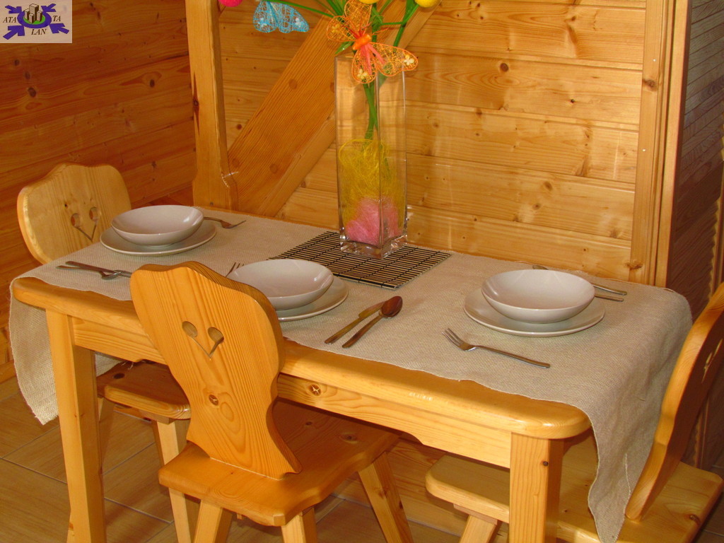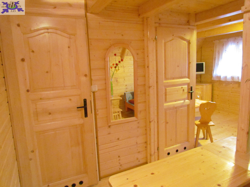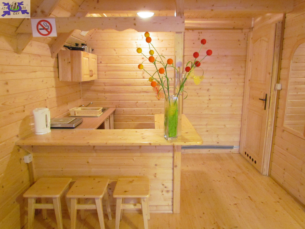 Przed wejściem do każdego domku jest ogródek z meblami ogrodowymi (stół i 2 ławki) jest on ogrodzony pergolami. Wnętrze domku wykończone jest drewnem.